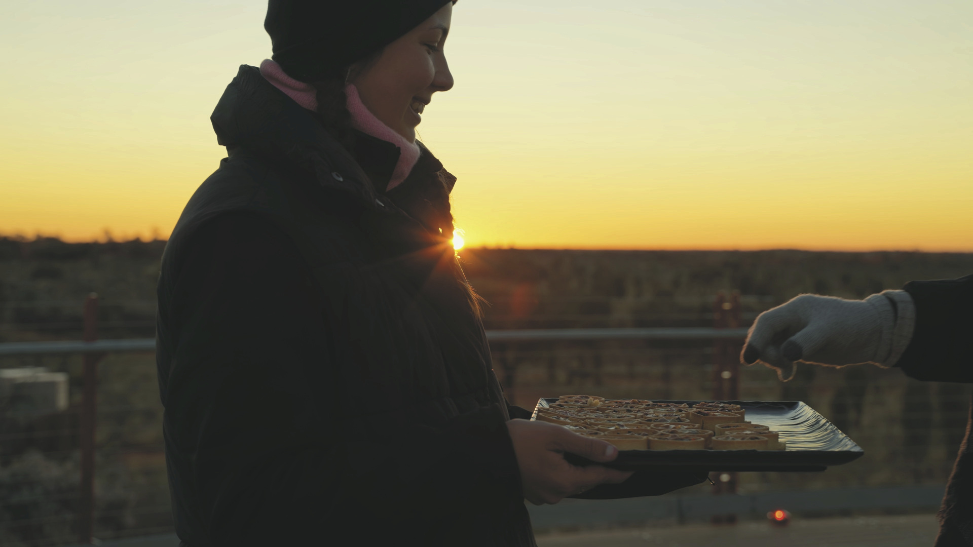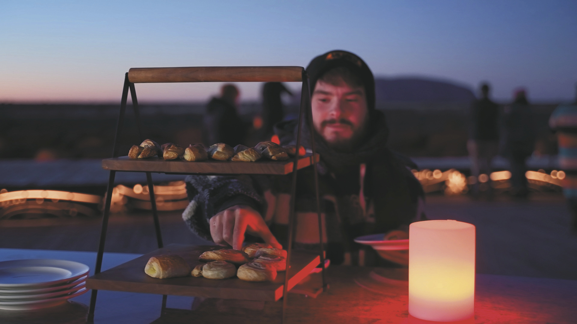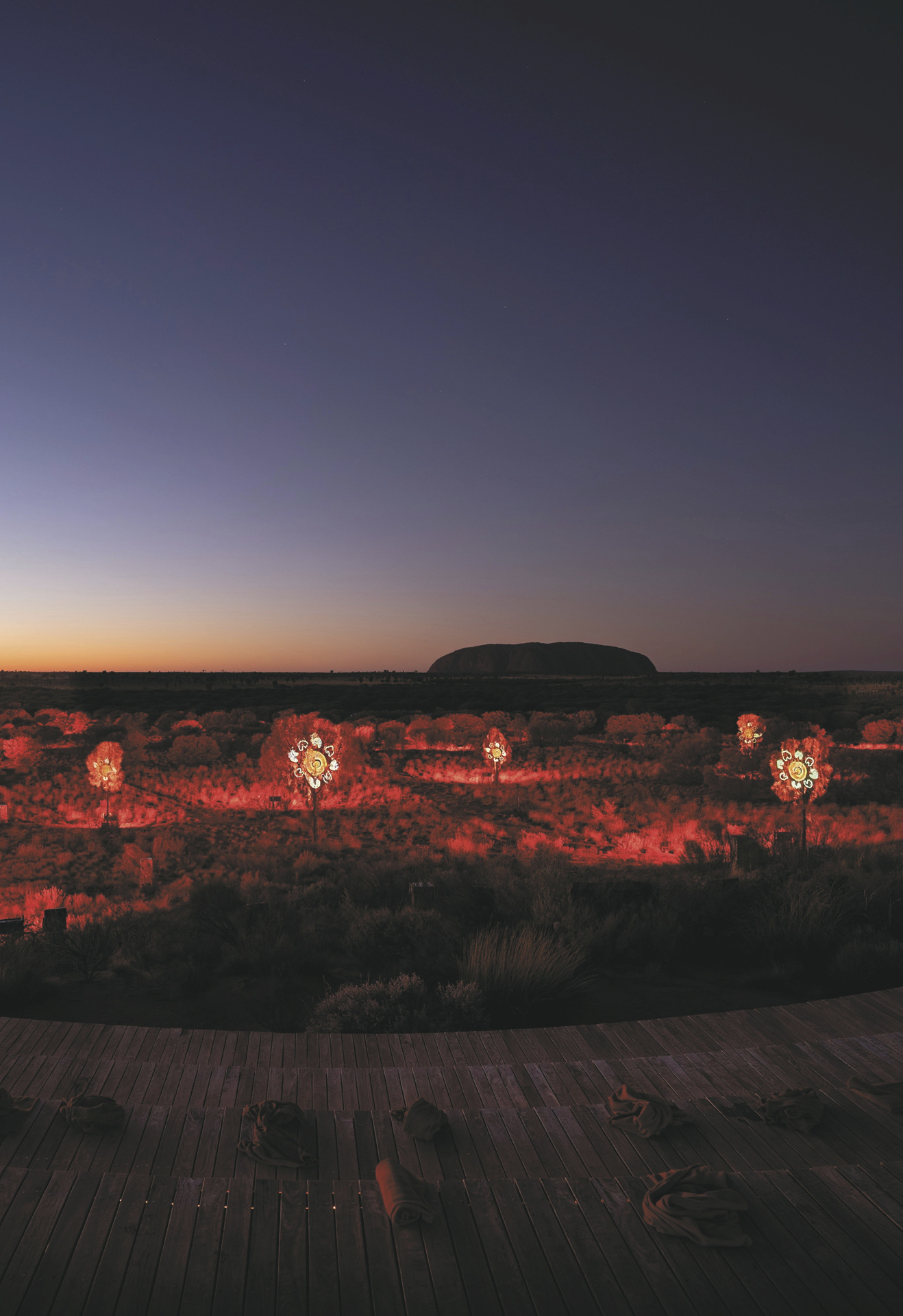 Sunrise Journeys rückt drei produktive Anangu-Künstlerinnen ins Rampenlicht, die sich zusammengetan haben, um ein maßgeschneidertes Kunstwerk zu schaffen, das ihre tiefe Verbindung zur Kultur und zum Land darstellt. Bevor sich die leuchtenden Silhouetten von Uluru und Kata Tjuta offenbaren, wird das Kunstwerk zum Leben erweckt, wobei die weite Wüstenlandschaft als natürliche Leinwand genutzt wird. Während sich die rote Erde unter der aufgehenden Sonne erwärmt, nehmen die Gäste auf der nachhaltig gebauten Plattform mit Blick auf Uluru und Kata Tjuta Platz und beobachten, wie das Kunstwerk mit modernster Laser- und Lichtprojektionstechnologie auf der weiten, dunklen Wüstenlandschaft darunter nachgebildet wird. Indigene Symbolik – ähnlich wie sie häufig in Punktmalereien zu sehen ist – beginnt sanft über das Land zu fließen. Im Anschluss an die Vorführung genießen die Gäste ein herzhaftes Frühstück mit einheimischen Spezialitäten, begleitet von einem australischen Chai-Tee.