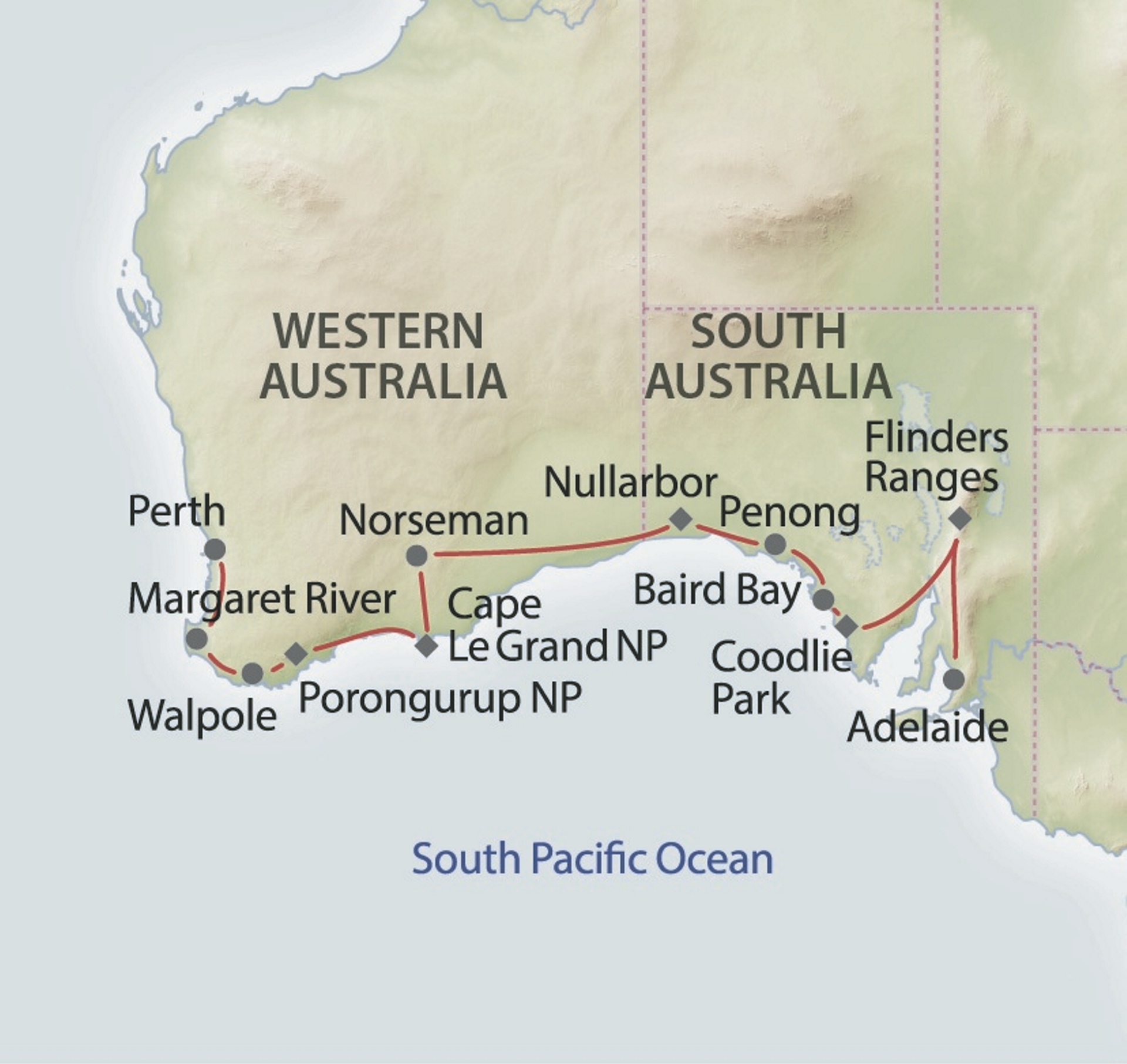 Die Strecke Adelaide Perth zählt zu einer der weltbesten Routen. Die Tierwelt macht sie zu einem einzigartigen Erlebnis. Sie können mit Seehunden und Delfinen schwimmen (optional), Australiens größten Vogel, den Keilschwanzadler, in der Luft bewundern und zwischen September und Oktober Wale beobachten. Die Mahlzeiten werden mit Liebe zubereitet, die Übernachtungsplätze sind einzigartig und Ihre erfahrenen Reiseleiter liefern Ihnen viel Hintergrundwissen - wahrhaftig ein Abenteuer zu wilden Plätzen.