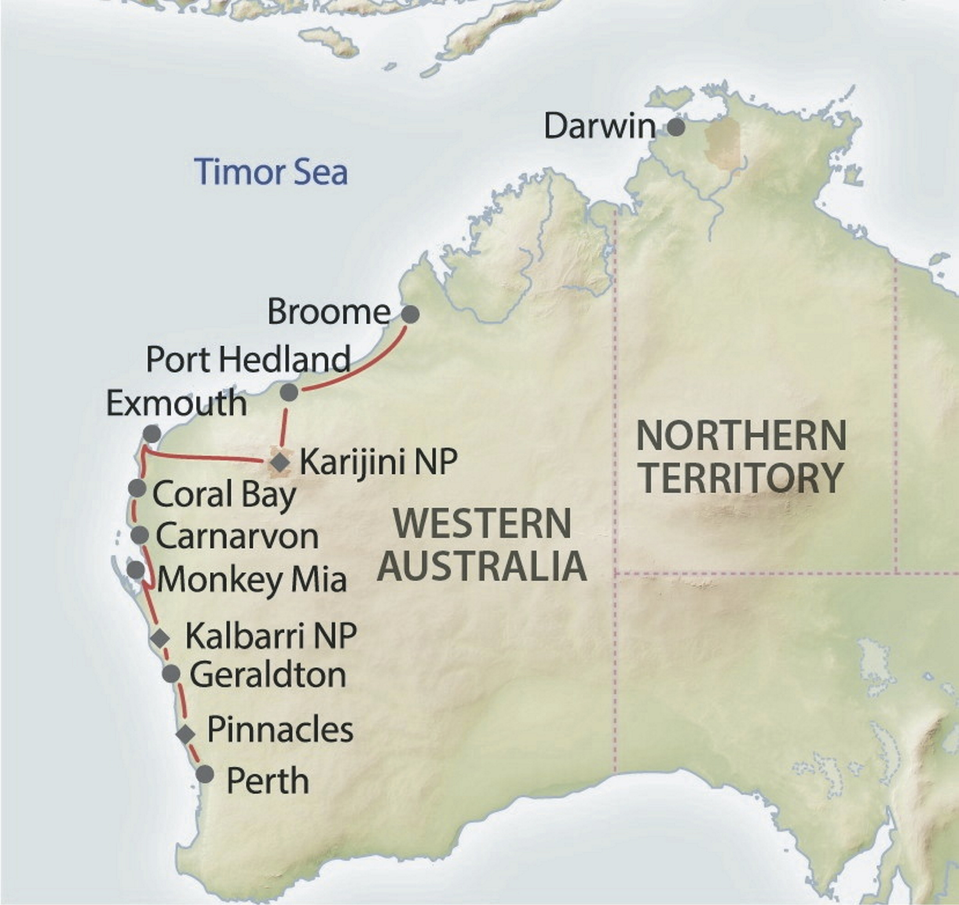 - Höhepunkte: Kalbarri NP, Delfine füttern, Ningaloo Reef, Karijini NP