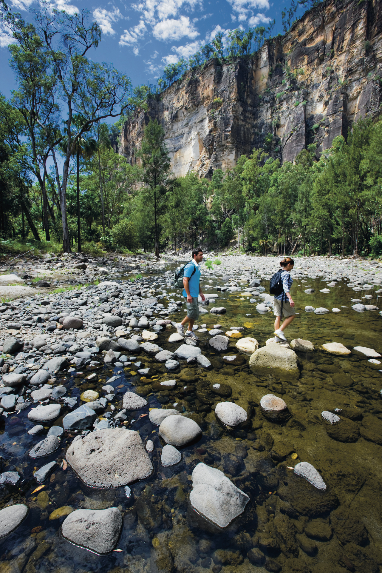 Der Carnarvon Nationalpark liegt mit seinen seltenen Farnen, Palmen und Moosen wie eine Oase im weiten, trockenen Hinterland. Hier finden Sie hohe Sandsteinschluchten und Felsmalereien der Ureinwohner, die über Tausende von Jahren erhalten geblieben sind. Die Galerien an den Wänden zählen zu den größten Kunststätten Zentralqueenslands und zeigen eine der besten Kollektionen von Schablonenmalerei. Die Hauptwerke befinden sich in der Art Gallery, in der Cathedral Cave und in der Kenniff Cave. Beeindruckende Wanderungen führen durch das üppige Grün.