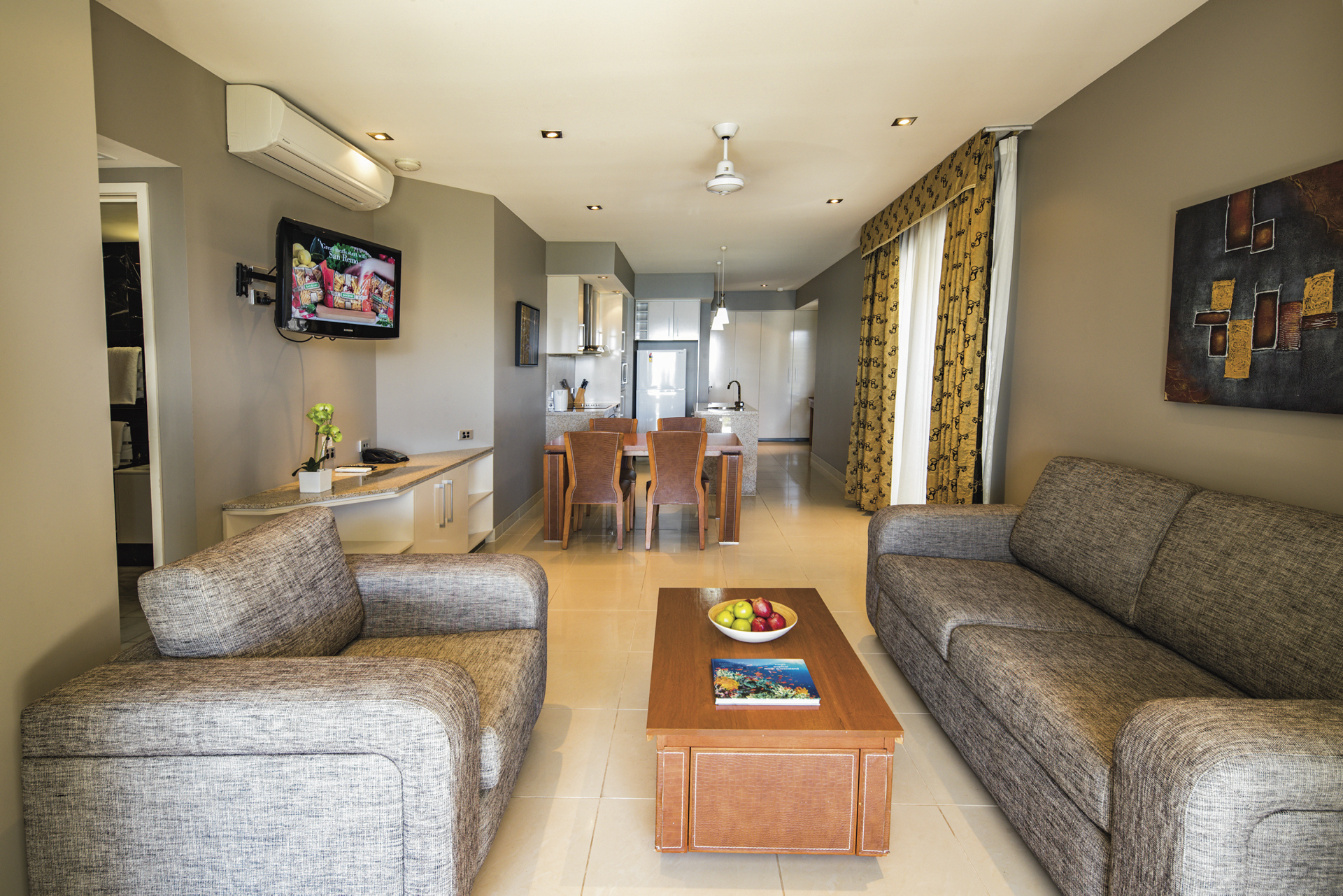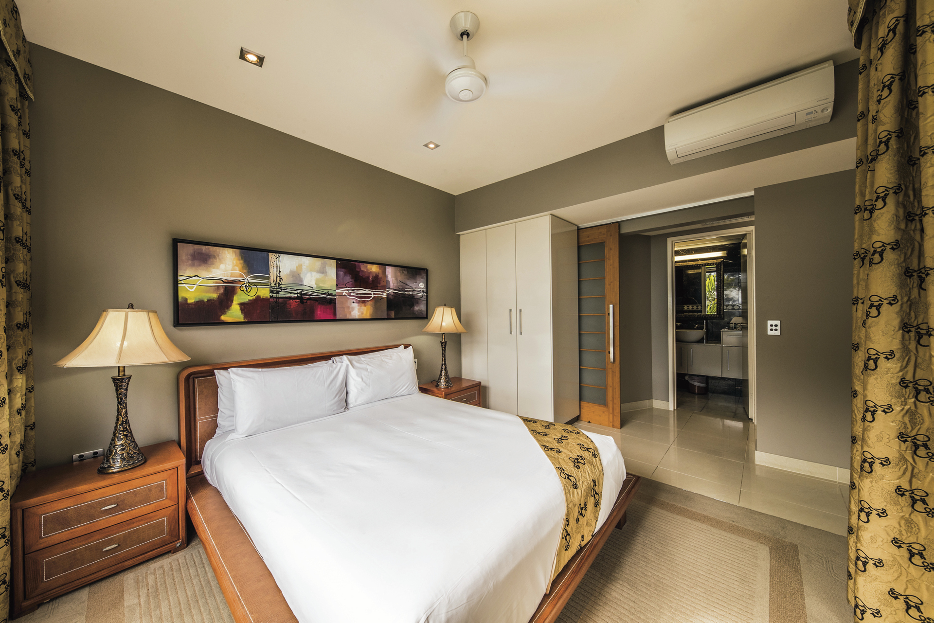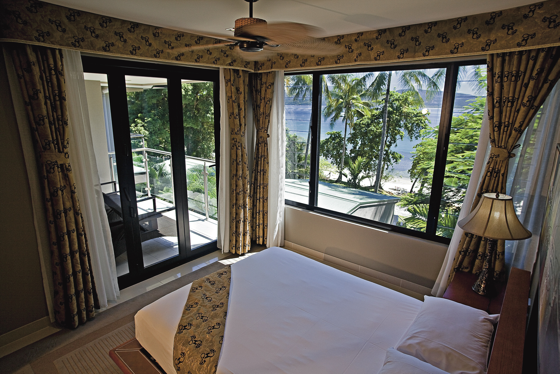 99 Zimmer verschiedener Kategorien. Alle mit Klimaanlage, Deckenventilator, Bad/WC mit schwarzem Marmor, Fön, Plasma-TV, Telefon, Uhrenradio, Minibar und Tee-/Kaffeezubereiter. Resort Studios wahlweise mit Doppel- oder Einzelbetten, aber ohne Balkon und ohne Aussicht. Island Suites mit Blick auf die Welcome Bay, mit großzügigem Wohn- und Essbereich, Küchenzeile, großem Balkon und 1 oder 2 Schlafzimmern.