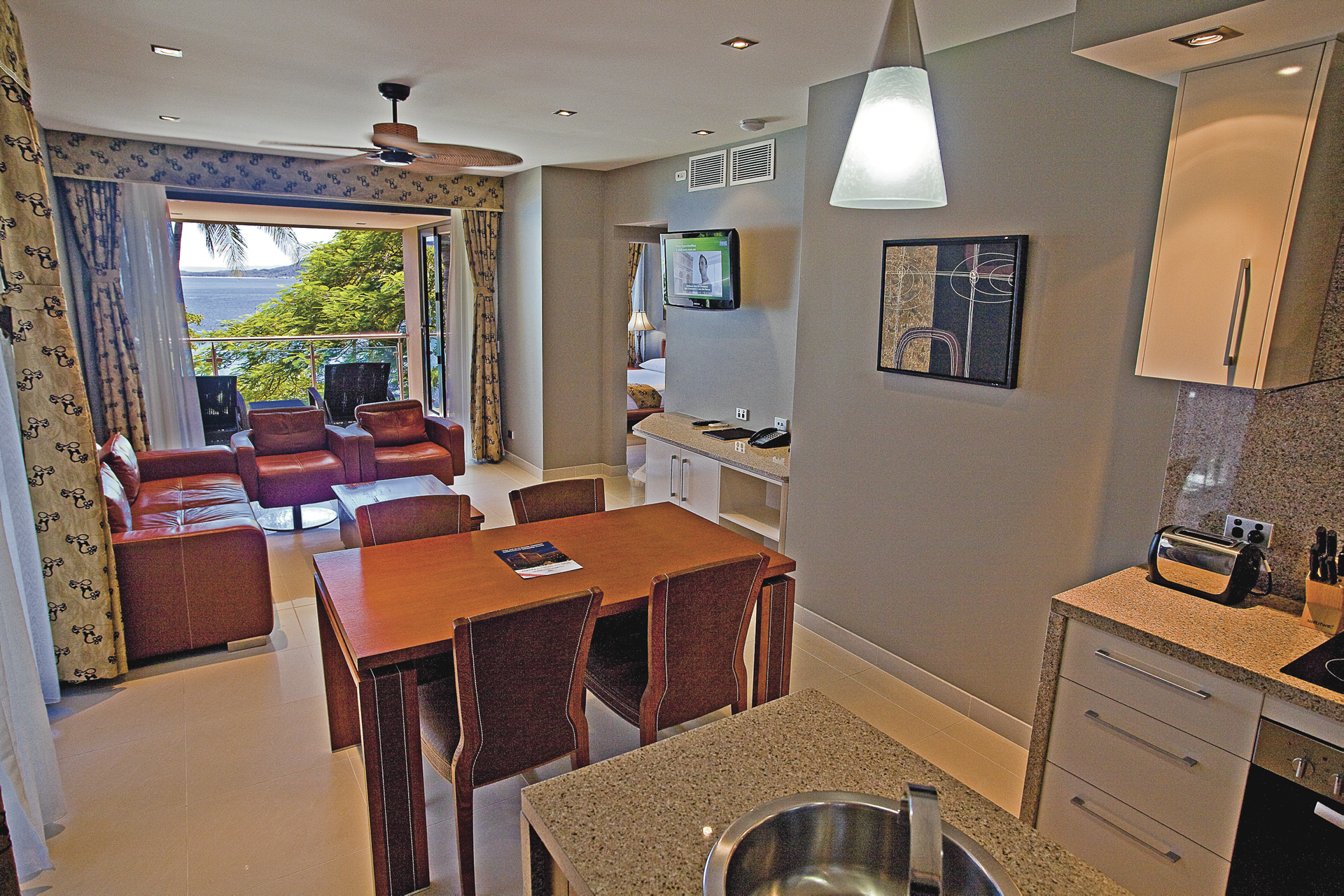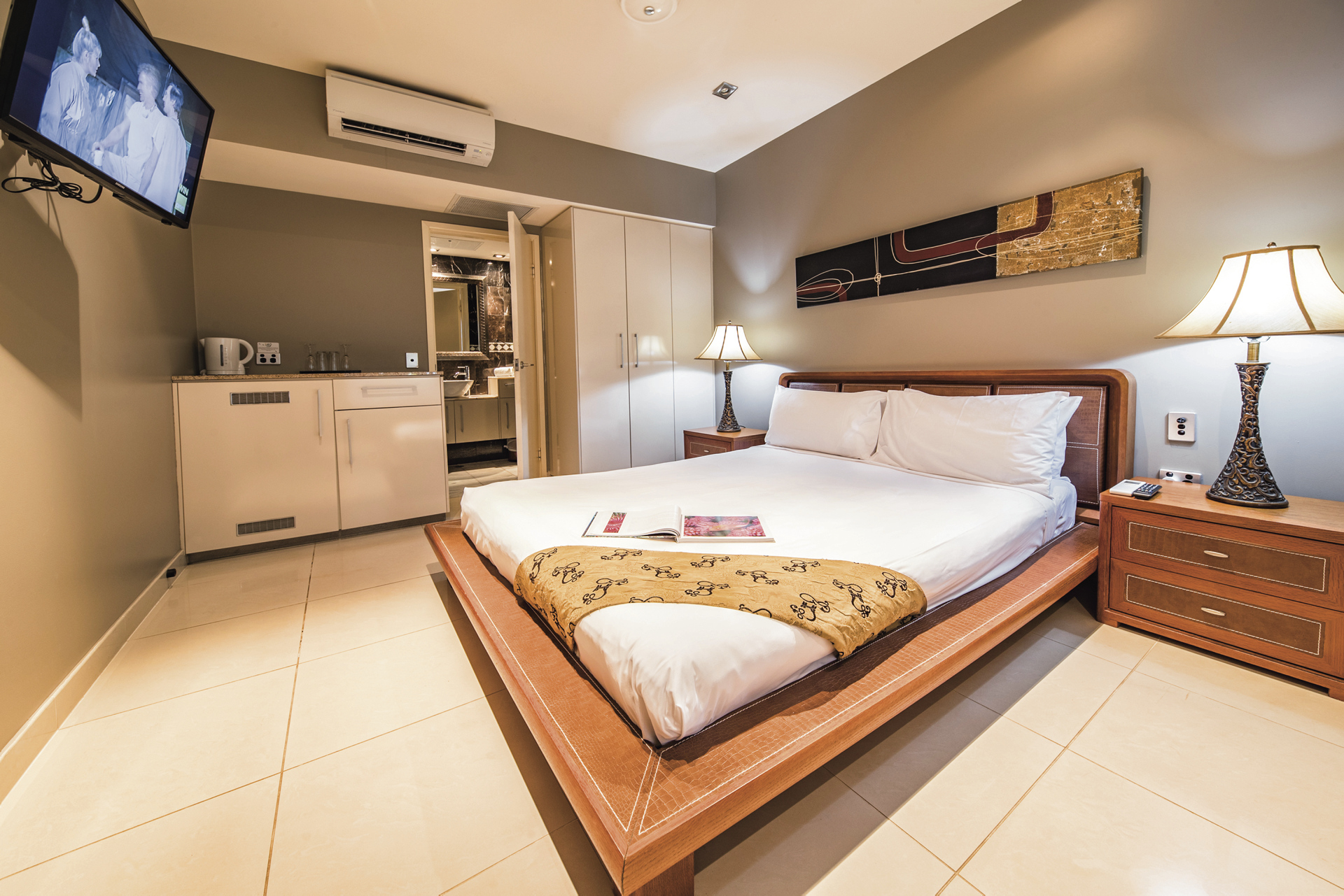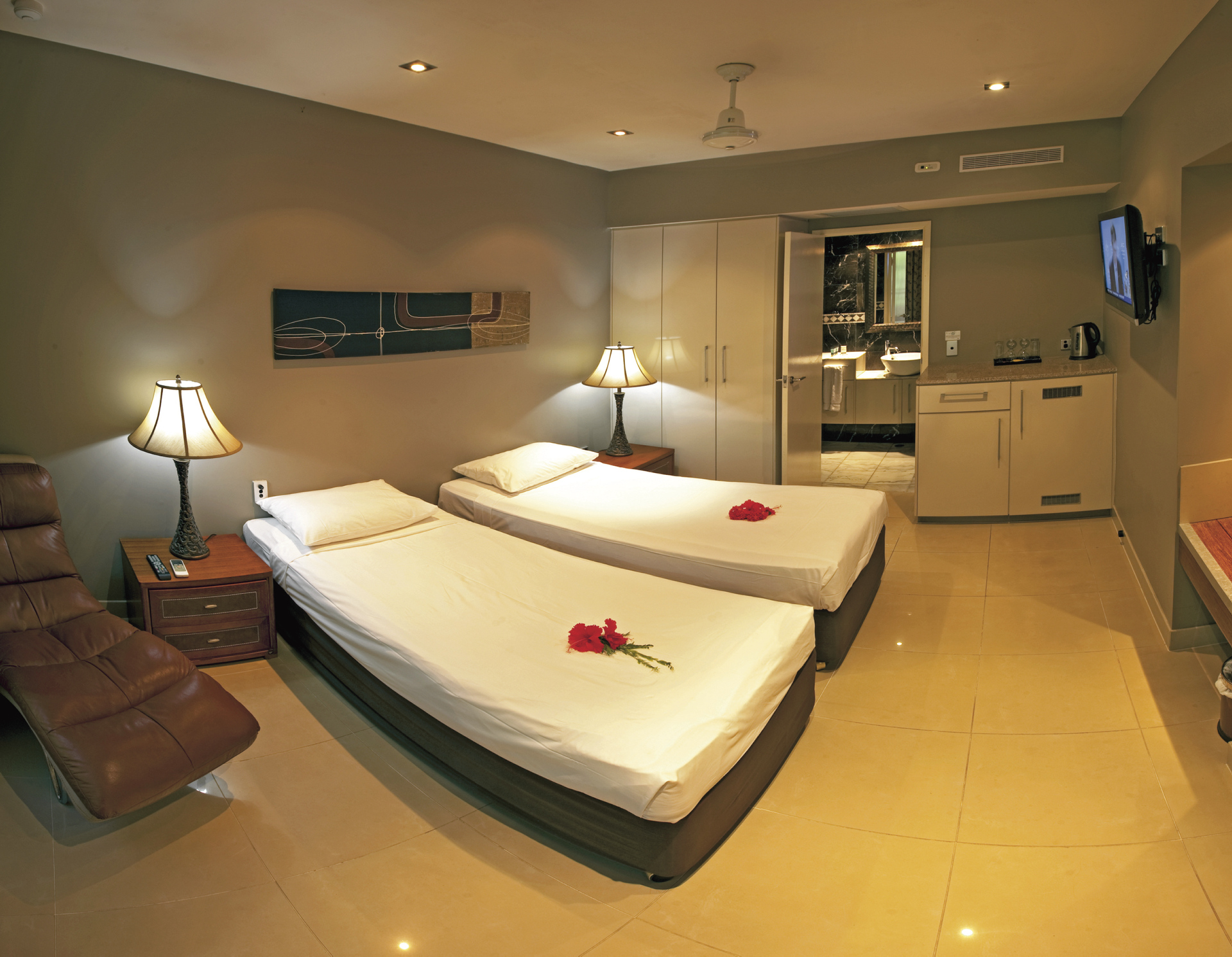 99 Zimmer verschiedener Kategorien. Alle mit Klimaanlage, Deckenventilator, Bad/WC mit schwarzem Marmor, Fön, Plasma-TV, Telefon, Uhrenradio, Minibar und Tee-/Kaffeezubereiter. Resort Studios wahlweise mit Doppel- oder Einzelbetten, aber ohne Balkon und ohne Aussicht. Island Suites mit Blick auf die Welcome Bay, mit großzügigem Wohn- und Essbereich, Küchenzeile, großem Balkon und 1 oder 2 Schlafzimmern.