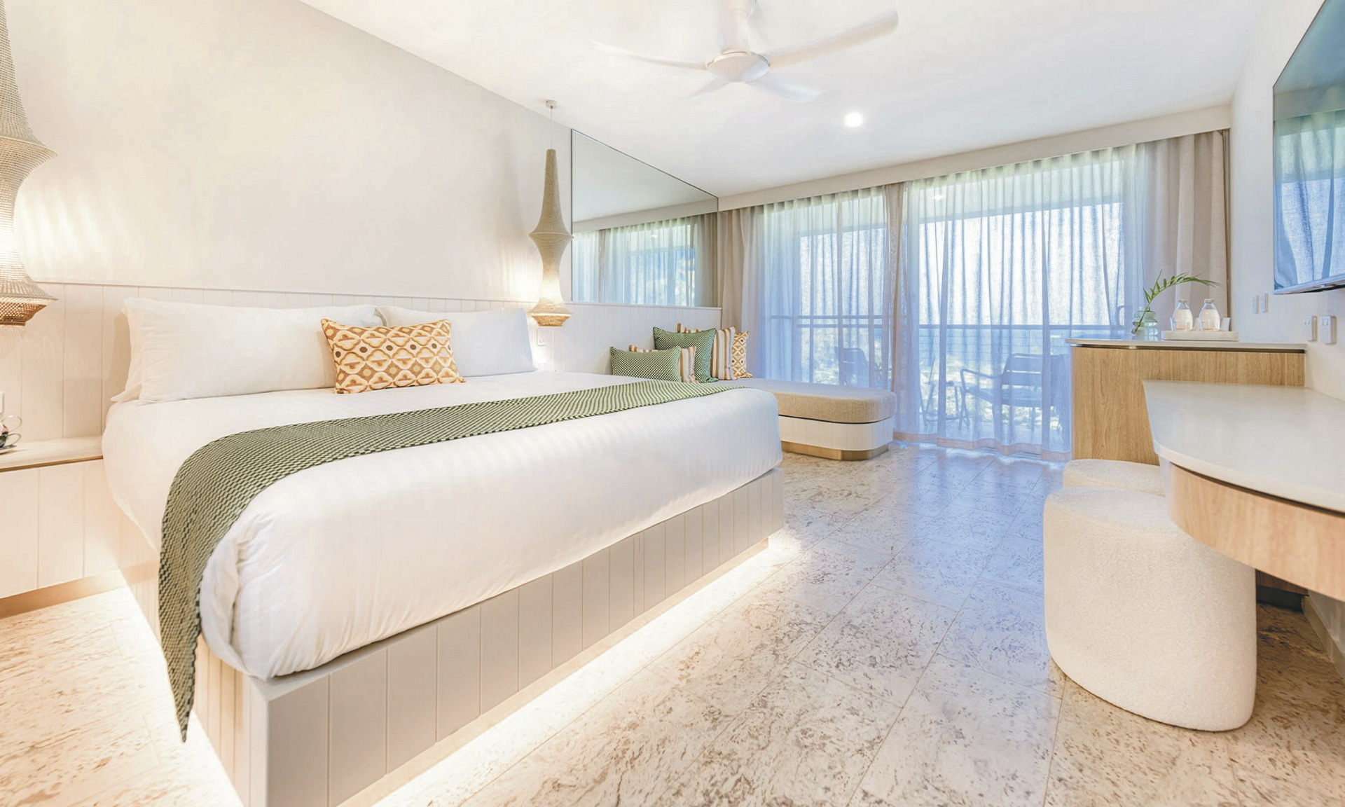 Das Resort verfügt über lediglich 20 Zimmer. Gartenblickzimmer liegen im Erdgeschoss und verfügen über zwei Balkone sowie wahlweise über ein Kingsize-Bett oder Einzelbetten. Meerblickzimmer mit Kingsize-Betten und einem Balkon liegen in der ersten Etage. Alle Zimmer sind modern eingerichtet und auf Komfort ausgerichtet. Sie bieten u.a. Klimaanlage, Deckenventilator, Bad mit Dusche, WC und Fön, Espresso-Maschine sowie ein bequemes Sofa. WLAN ist kostenfrei.