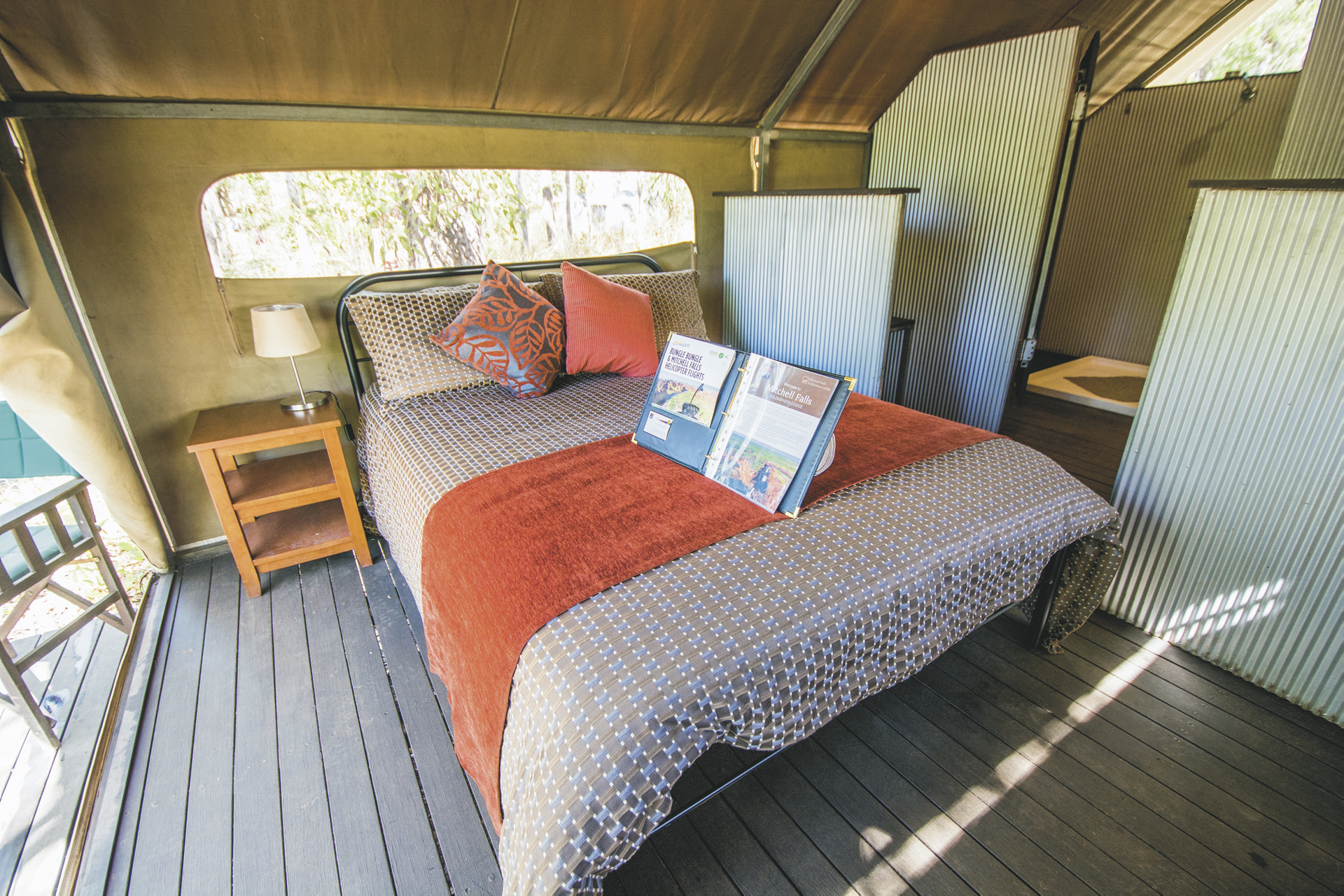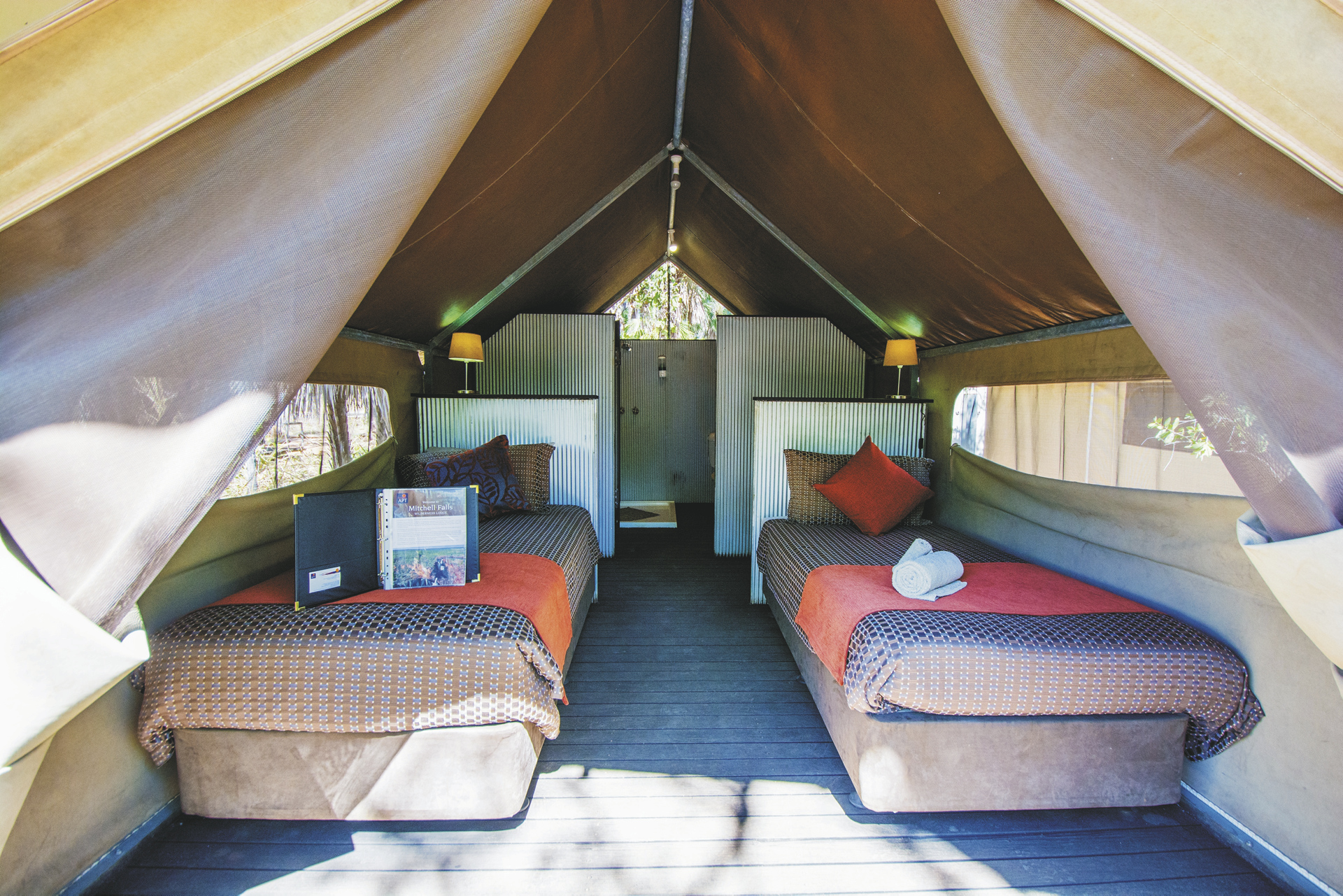 24 permanente Zelte (6 x 3 m groß) mit festem Holzfußboden, Dusche/WC, Doppelbett oder zwei Einzelbetten, Nachttisch, Gepäckablage, elektrischem Licht und kleinem Deck mit Stühlen.