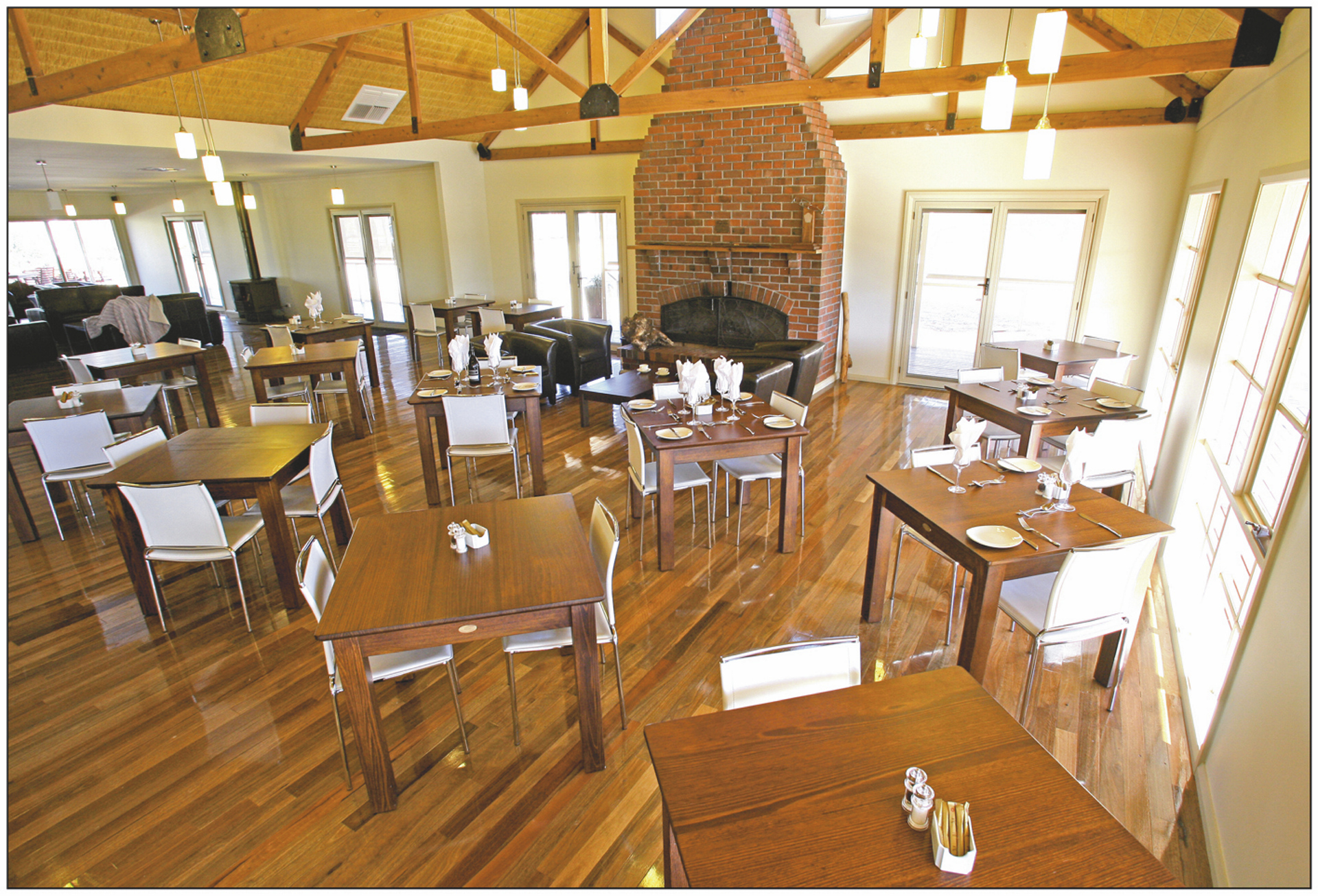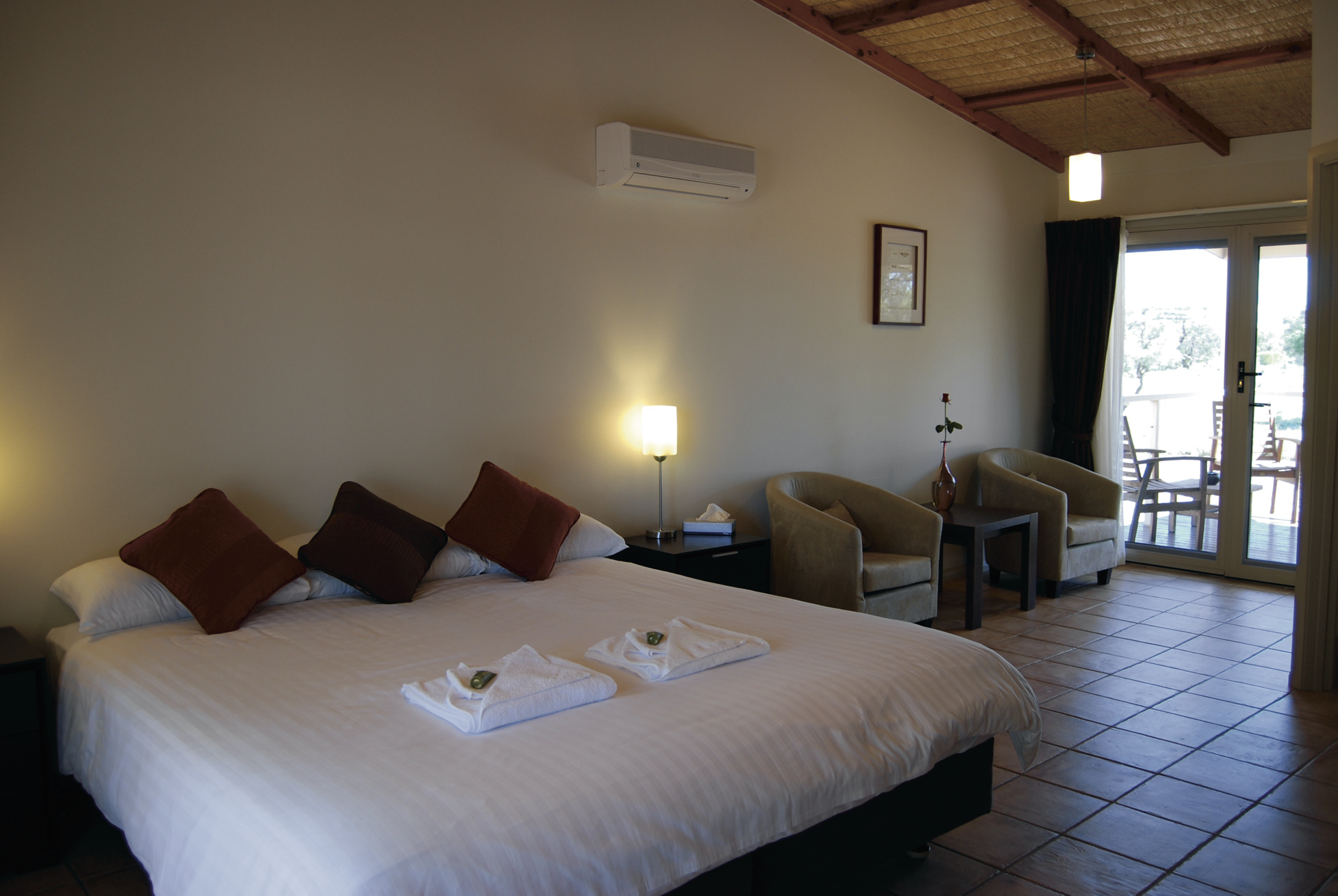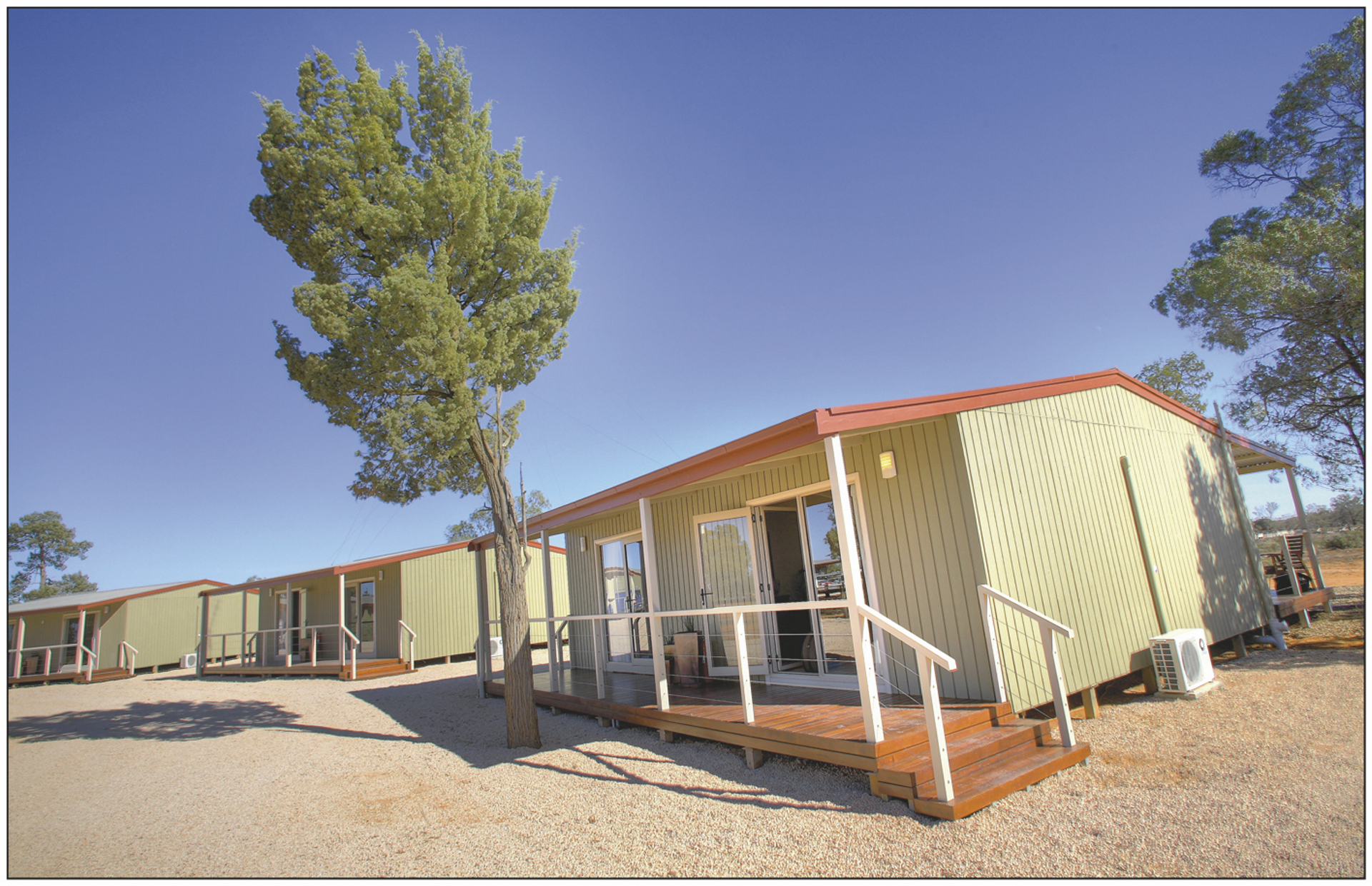 17 modern eingerichtete Cabins mit Bad, Klimaanlage/Heizung, TV, Telefon, Tee-/Kaffeezubereiter und privater Terrasse.