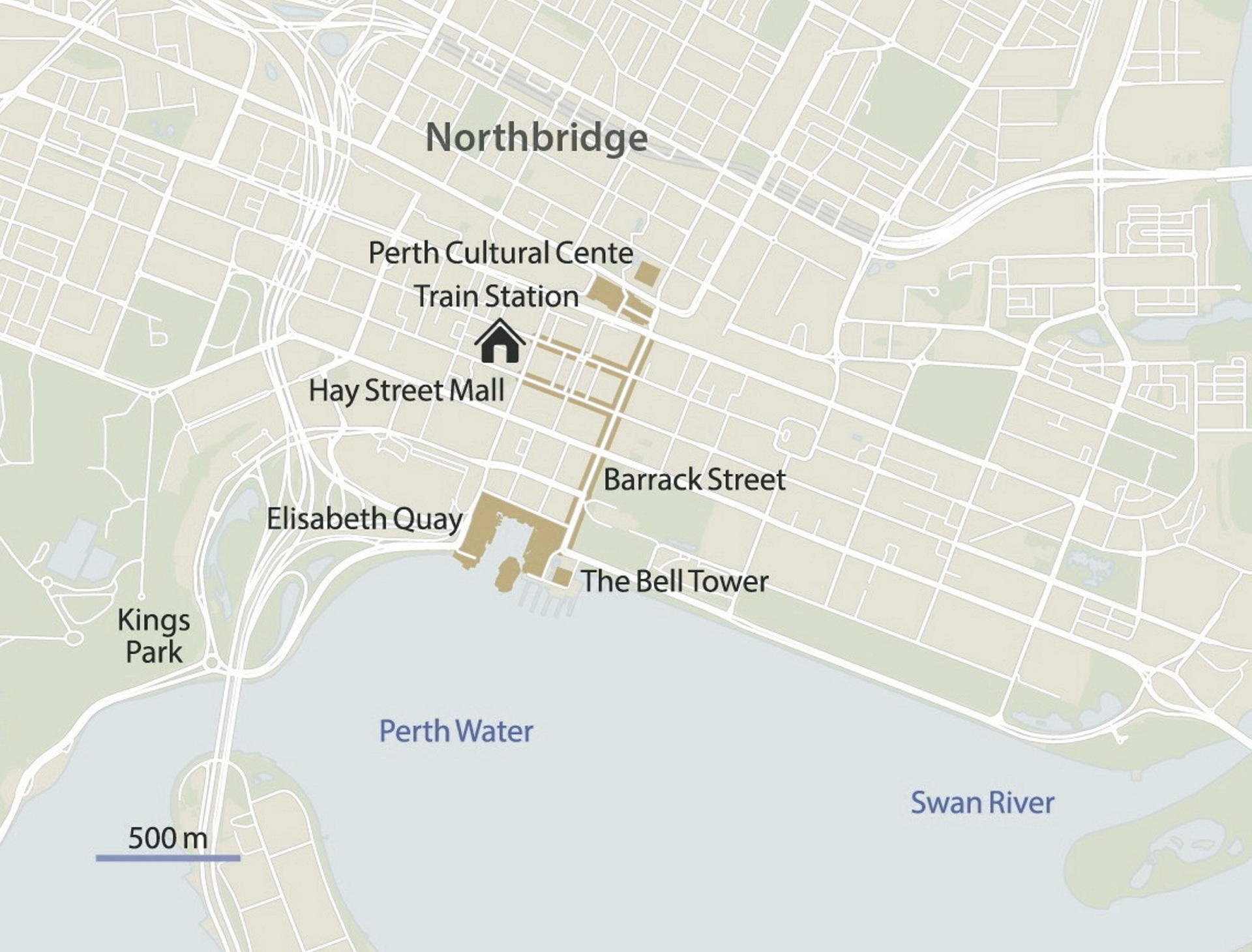 In der Hay Street im Herzen des Stadtzentrums, mit Attraktionen, Unterhaltungs- und Einkaufsmöglichkeiten direkt der Haustür. Einen Block vom Bahnhof entfernt.