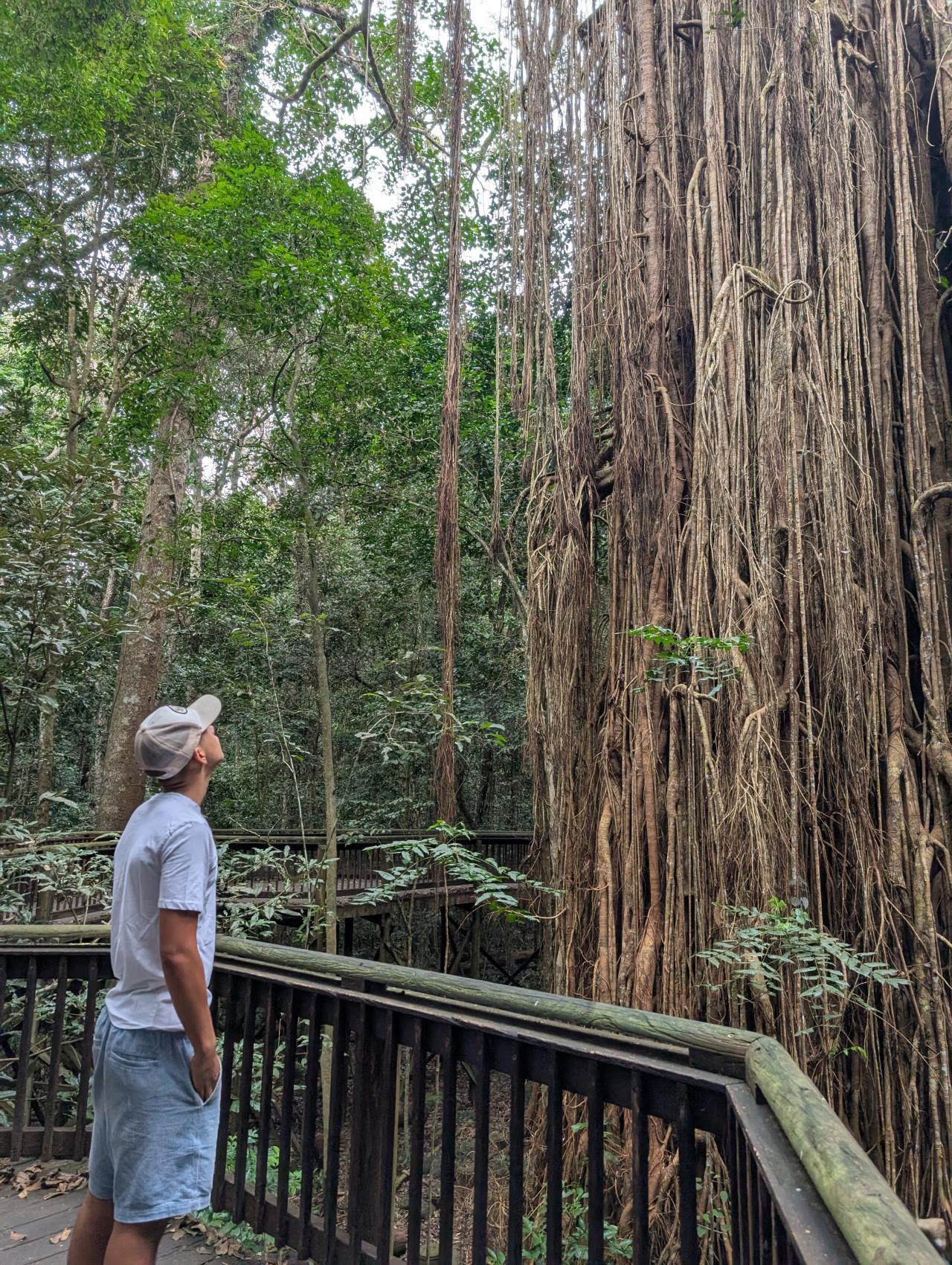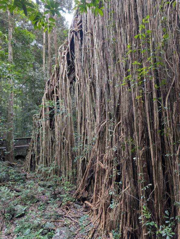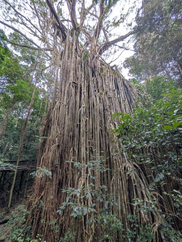 Nach dem Frühstück halten wir am Curtain Fig Tree. Dieser gehört zu den bekanntesten Sehenswürdigkeiten der Atherton Tablelands. Und entsprechend viele Autos halten an. Alle gehen die kleine Runde um die riesige Würgefeige herum. Beeindruckend ist der Curtain Fig Tree in jedem Fall.