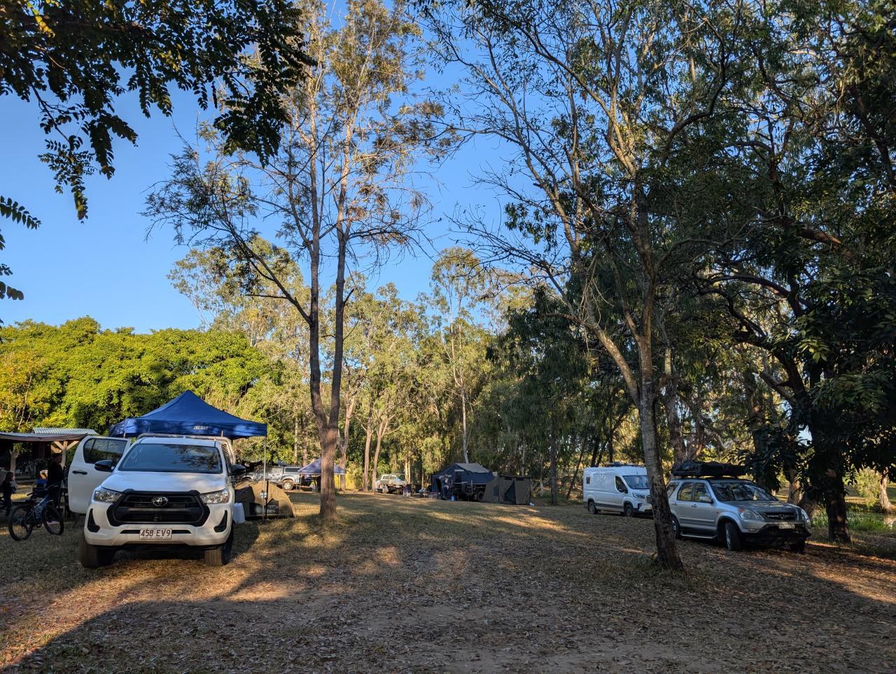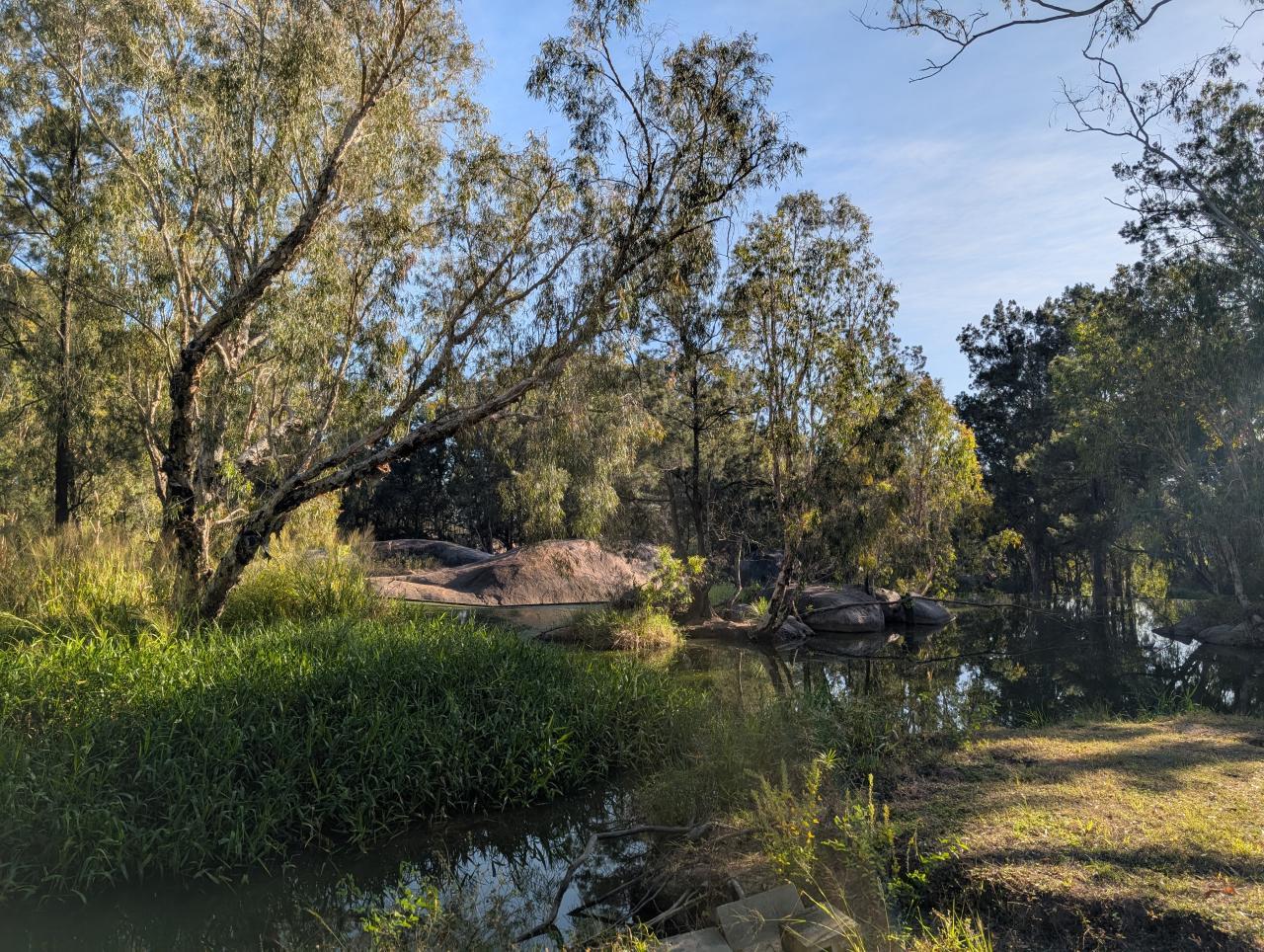 Wir fahren weiter zum Campingplatz an der Granite Gorge. Über das Wochenende finden sich unzählige australische (Groß-) Familien mit ihren Wohnwagen hier ein. Wir sind das einzige 'richtige' Wohnmobil. Der Granite Gorge Caravan Park bietet Stellplätze in der Nähe der Felsen, am Bächlein und bei einer Pferdekoppel.