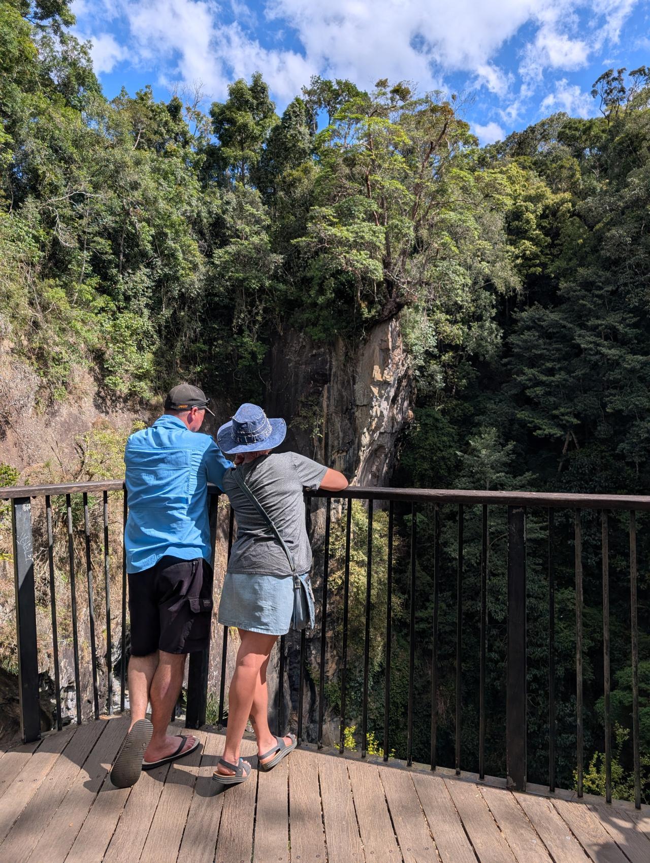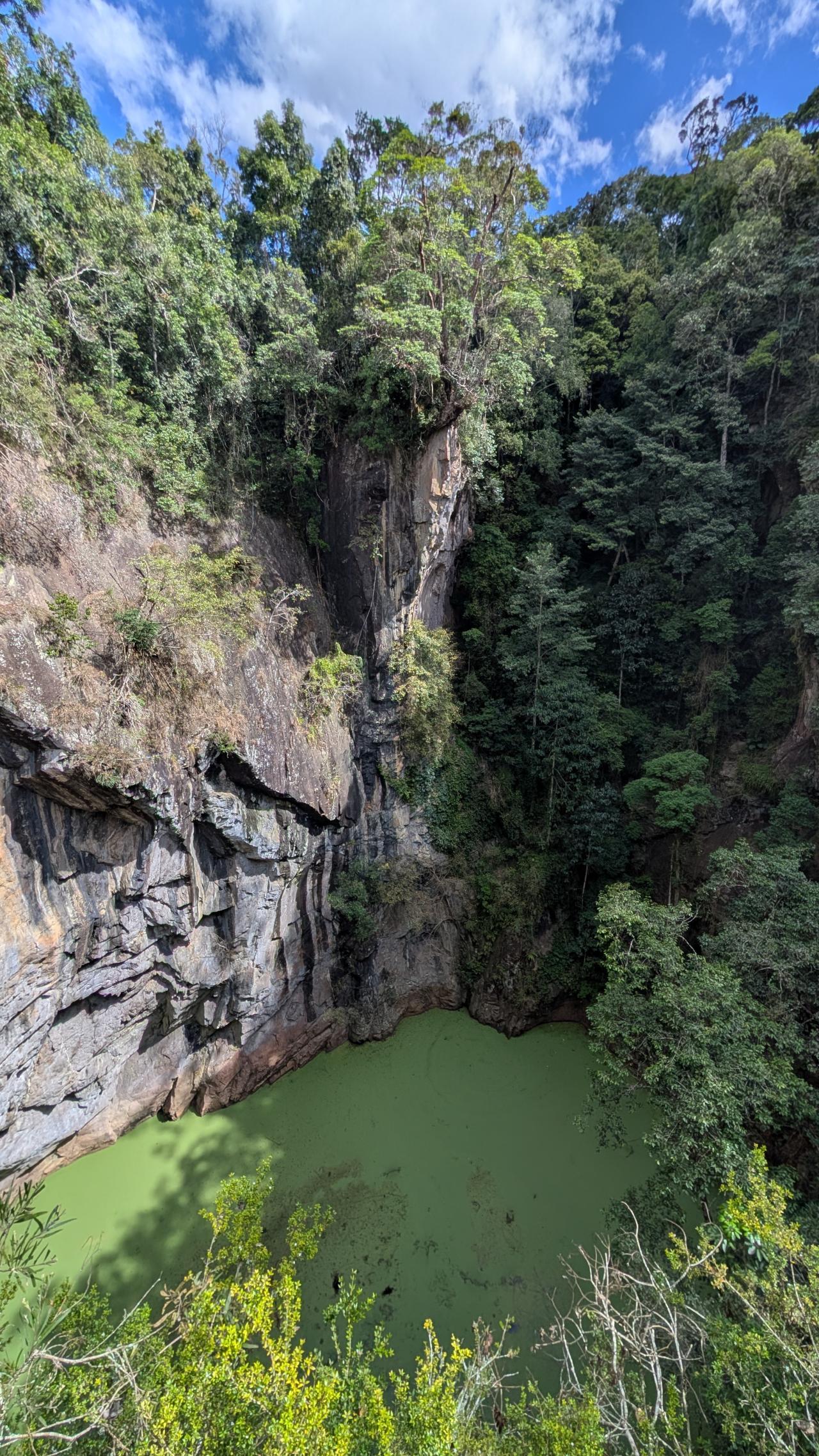 Gestärkt machen wir uns auf zum Mount Hypipamie Nationalpark. Die kleine Wanderrunde bringt uns zu den malerischen Dinner Falls und zu einer geologischen Besonderheit: einem Diatrem. Ein Diatrem ist eine riesige Röhre vulkanischen Ursprungs. Durch eine Explosion wurde der 82 m tiefe, vulkanische Schlot freigelegt. Ringsum liegt Urwald. Äste ranken am Gestein hinab. Von der Aussichtsplattform sehen wir in der Tiefe einen See.