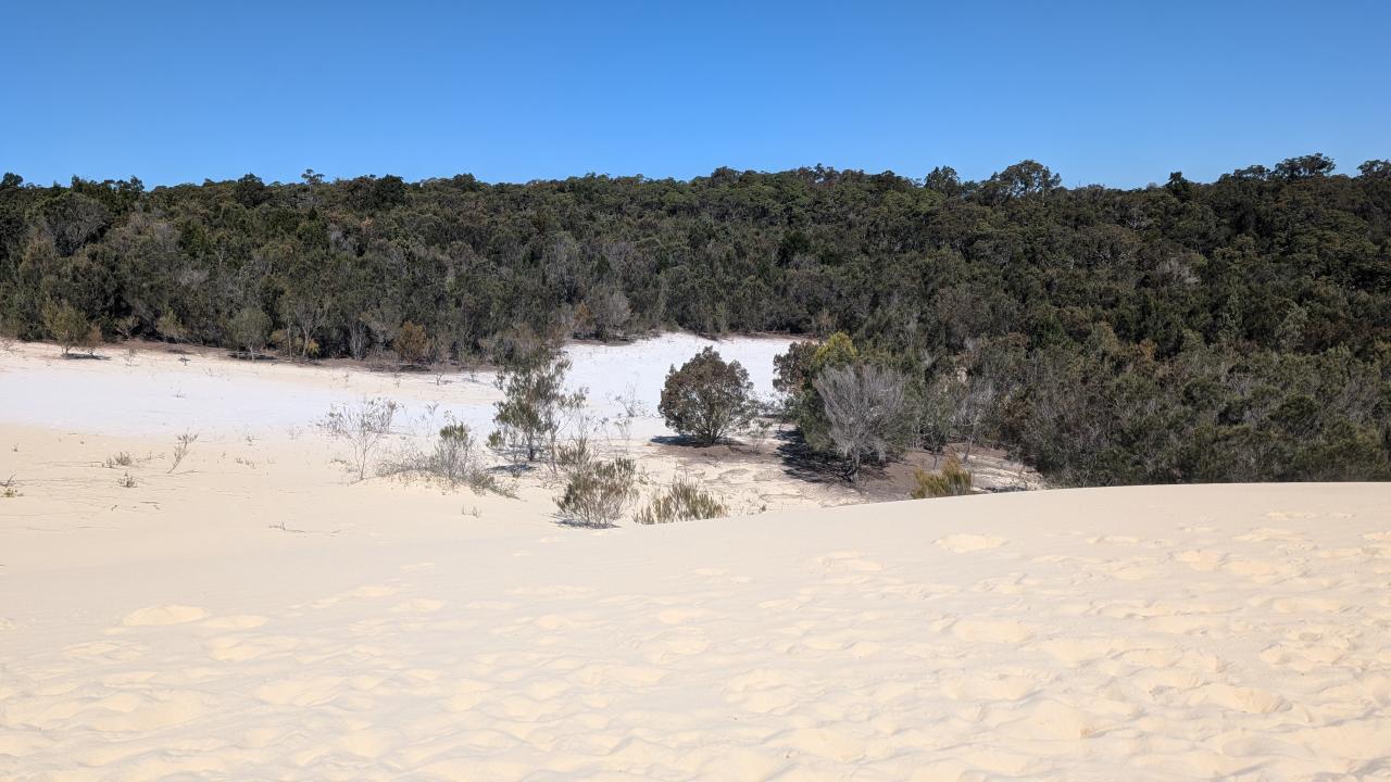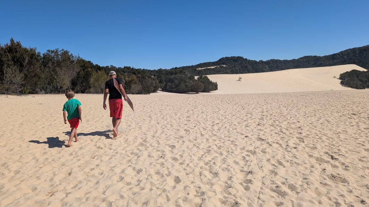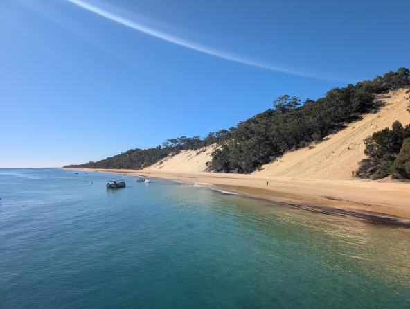 Nach einem Mittagessen (Wraps, Chips, Wasser) fahren wir mit einem Allradbus ca. 6 km bis zu The Desert. Die Dünenlandschaft auf Moreton Island dient dem Sandboarding. Mit dem Kopf voraus geht es für Mutige auf Brettern die steile Sanddüne hinunter. Im Anschluss geht es zurück an den Strand. Für eine kleine, kurze Schwimmrunde bleibt gerade noch Zeit, bevor die Micat ablegt und ihren Weg zurück zum Port of Brisbane antritt.