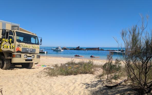 Die Höhepunkte von K'gari lernt man im Rahmen einer geführten Tour im Allradbus an einem Tag kennen. Es geht unter anderem auch am den 75 Mile Beach und zum Schiffswrack Maheno. Das Befahren des Sandstrandes ist mit Geländewagen möglich und erlaubt. Vom Baden im Pazifik sollte man jedoch absehen. Die Ostküste ist bekannt für Haie. Stattdessen lockt eine Abkühlung im glasklaren Eli Creek.