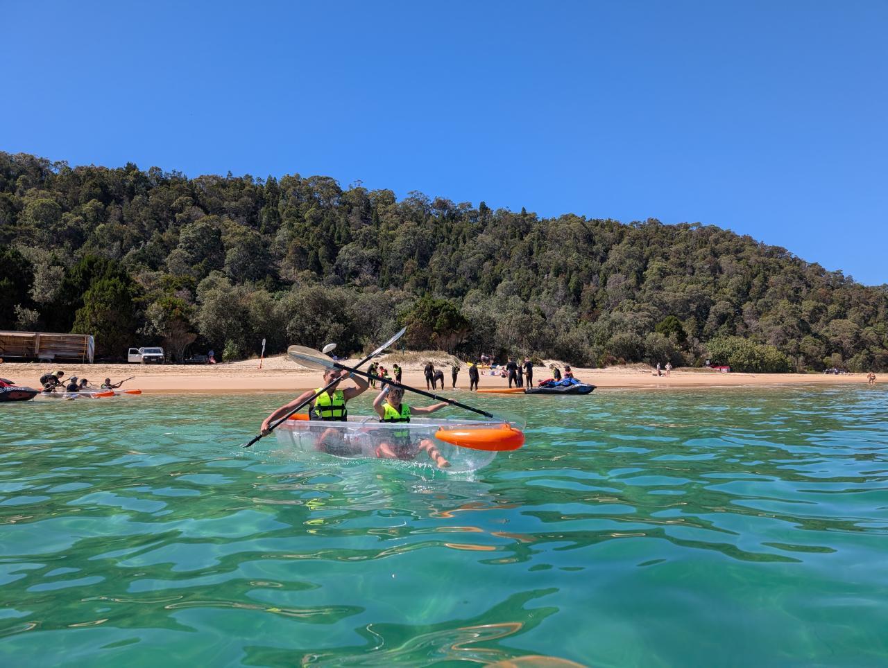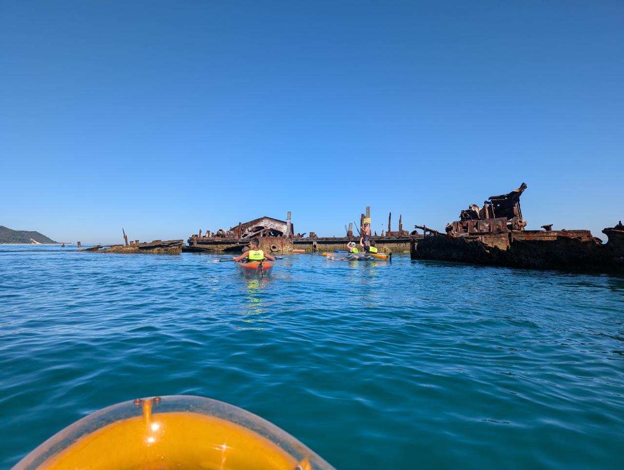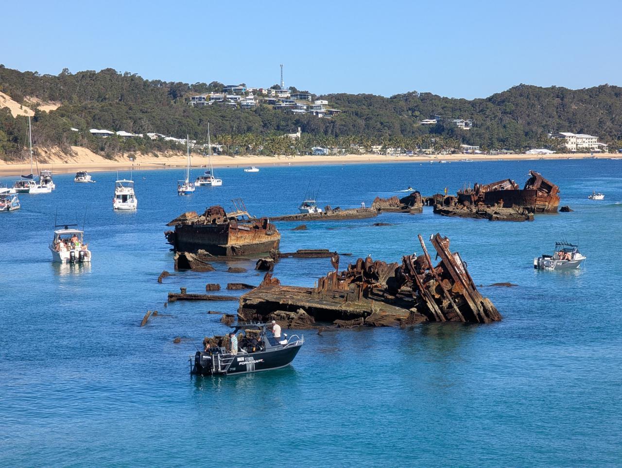 Es gibt geführte Tagesausflüge von Sunset Safaris nach Moreton Island, die in Brisbane starten. In der Früh gegen 7 Uhr ist Abfahrt am Busbahnhof von Brisbane in der Roma Street. Ein Bus bringt die Teilnehmer zum Port of Brisbane, wo um ca. 8 Uhr die Fähre nach Moreton Island ablegt. Um 9.30 Uhr geht es am Strand von Bord, nur wenige Meter von den Tangalooma Wrecks entfernt. Wer eine Tour gebucht hat, wird mit Schnorchelausrüstung und Neoprenanzug ausgestattet und nimmt an einer 45-minütigen Schnorcheltour teil. Anschließend geht es mit durchsichtigen Kajaks nochmals für ungefähr die gleiche Zeit um die Wracks herum. Kajaks, Paddel und Schwimmwesten werden gestellt. Wir sehen einen kleinen Raubvogel über den Wracks kreisen und blitzschnell einen Fisch fangen.
