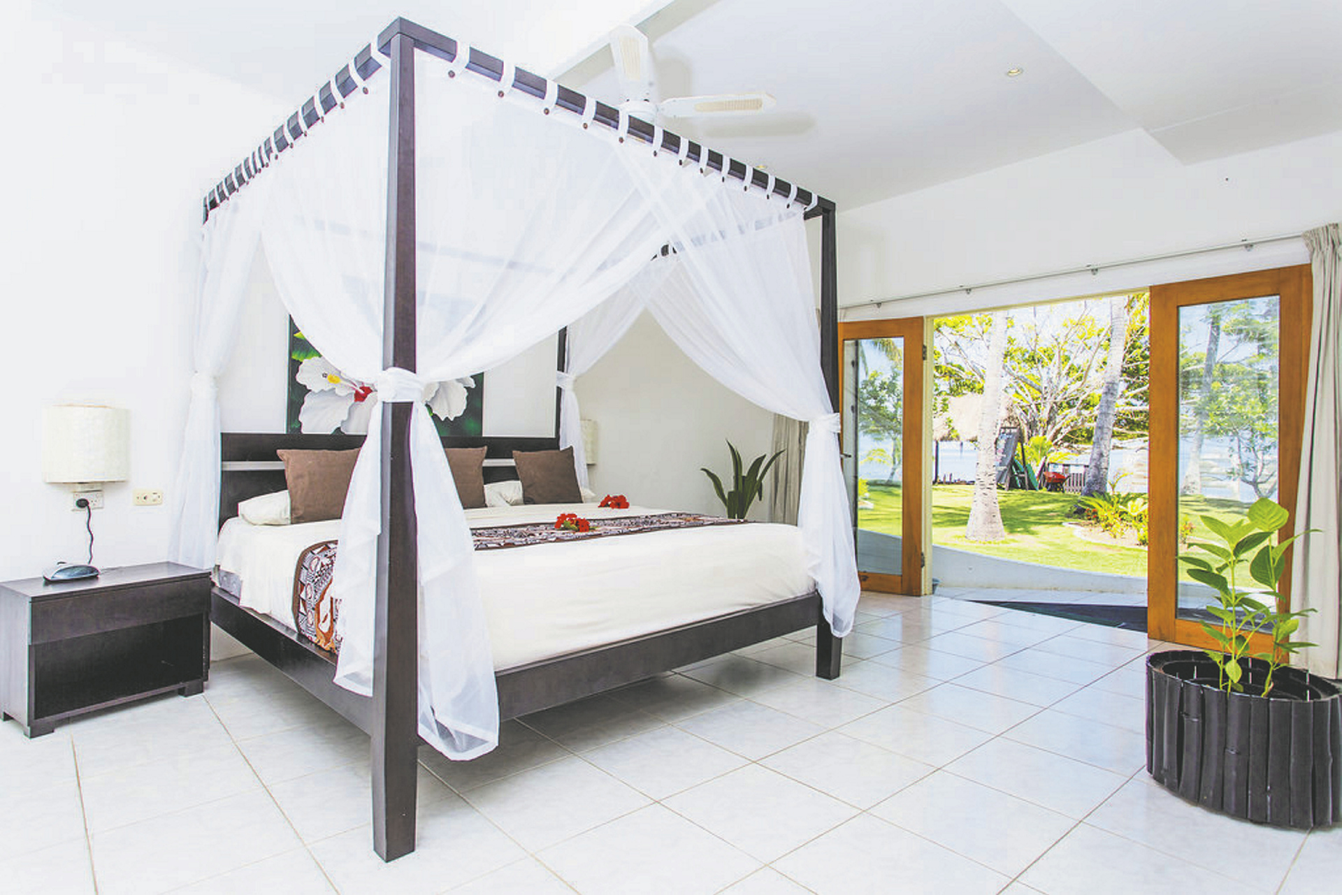 Alle Unterkünfte bieten Meerblick und sind klimatisiert. Sie verfügen über Ventilator, Tee-/Kaffeezubereiter, kleinen Kühlschrank, Telefon, TV, DVD, und Safe. Im Haupthaus befinden sich die 70qm großen Deluxe-Suiten mit privatem Balkon. Die 65 qm großen Strandbungalows teils mit und ohne privatem Pool haben ein Sonnendeck und eine große Außendusche.