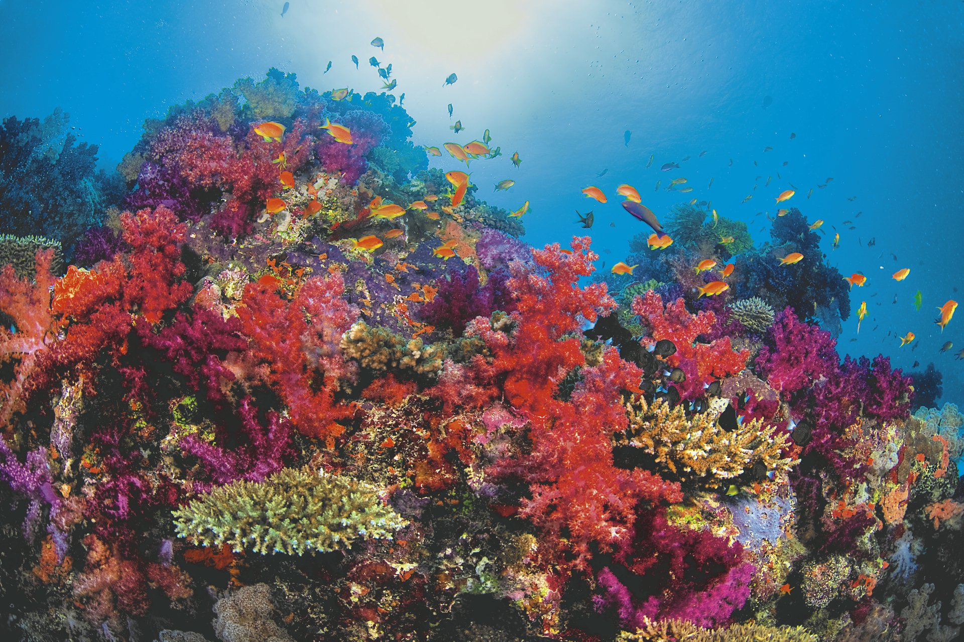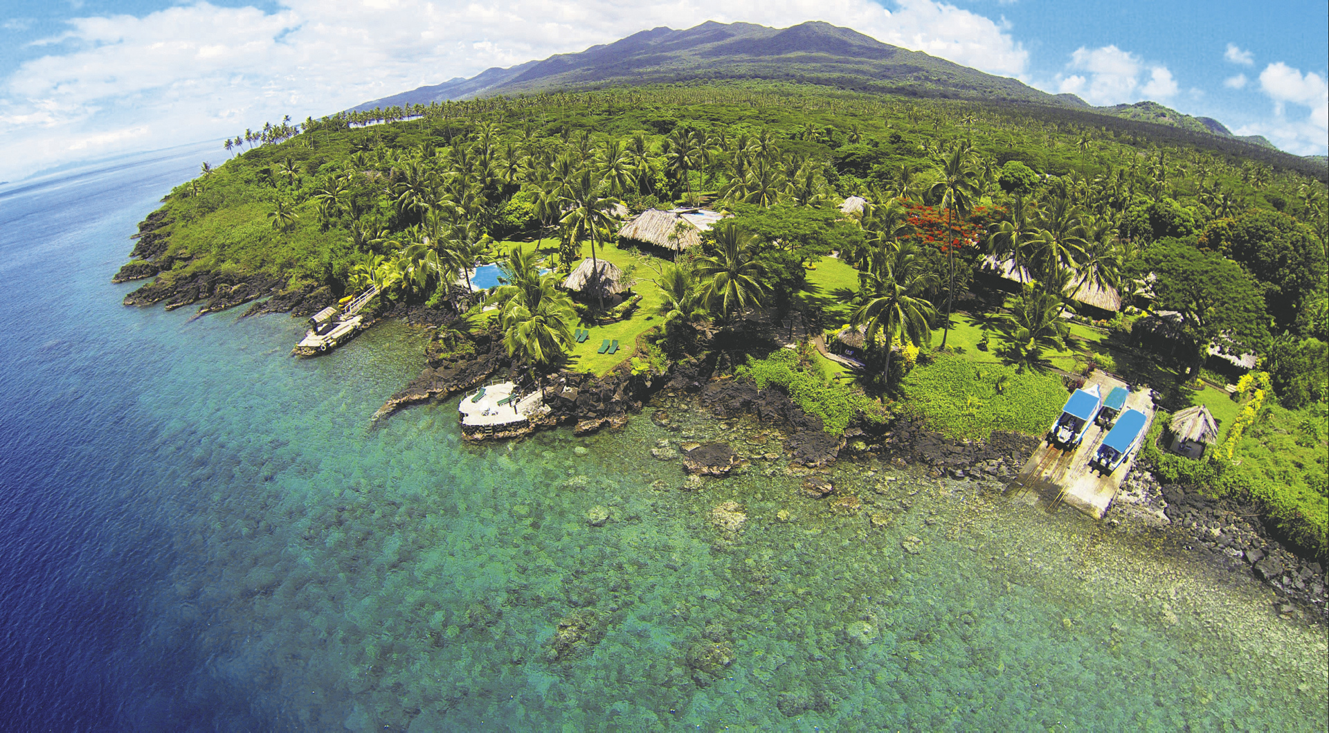 Das Resort liegt erhöht, mit Blick auf die Somosomo Meeresstraße, Schwimmen und Schnorcheln sind jederzeit möglich.