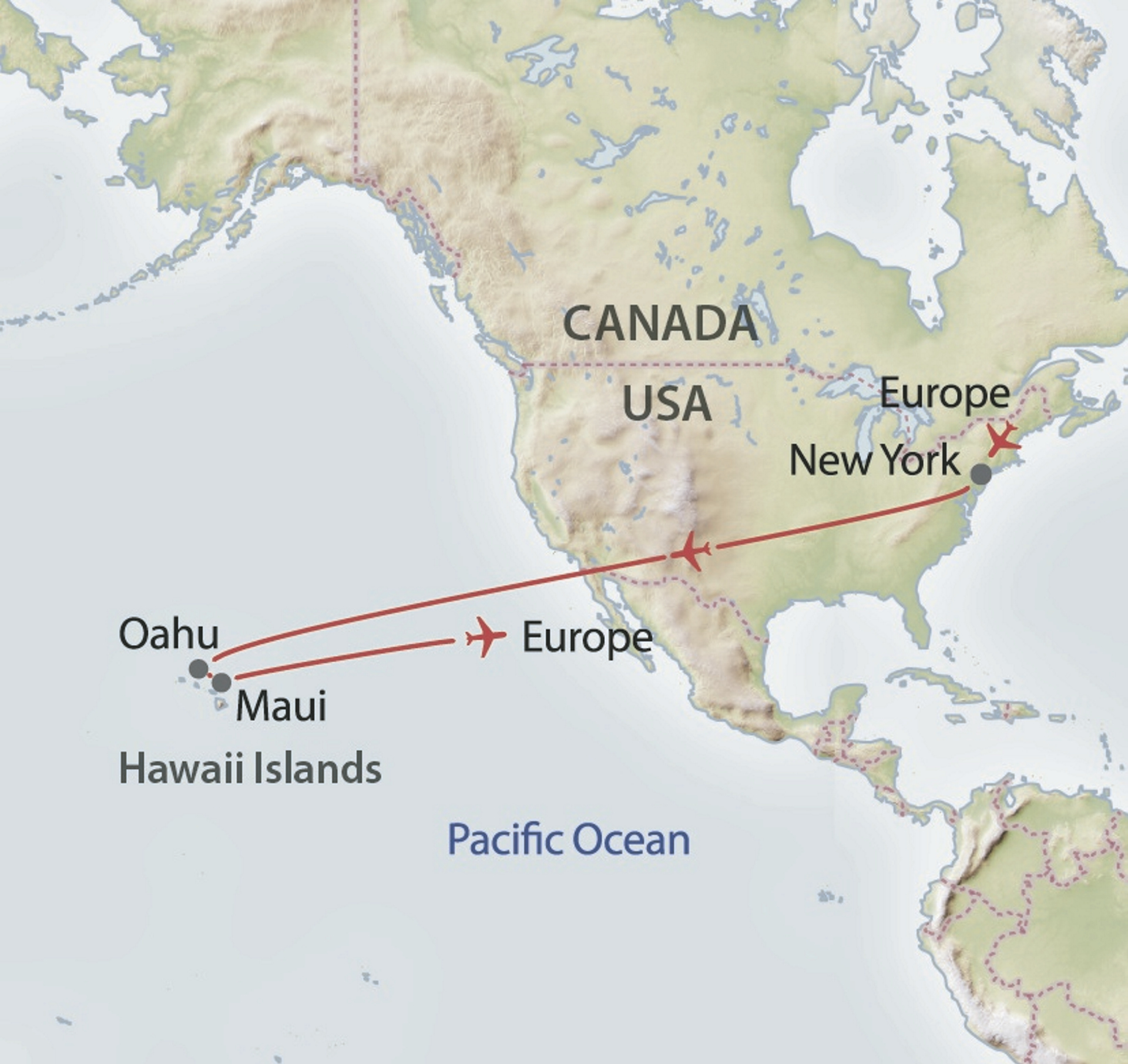- Übernachtungen in New York, auf Oahu und Maui