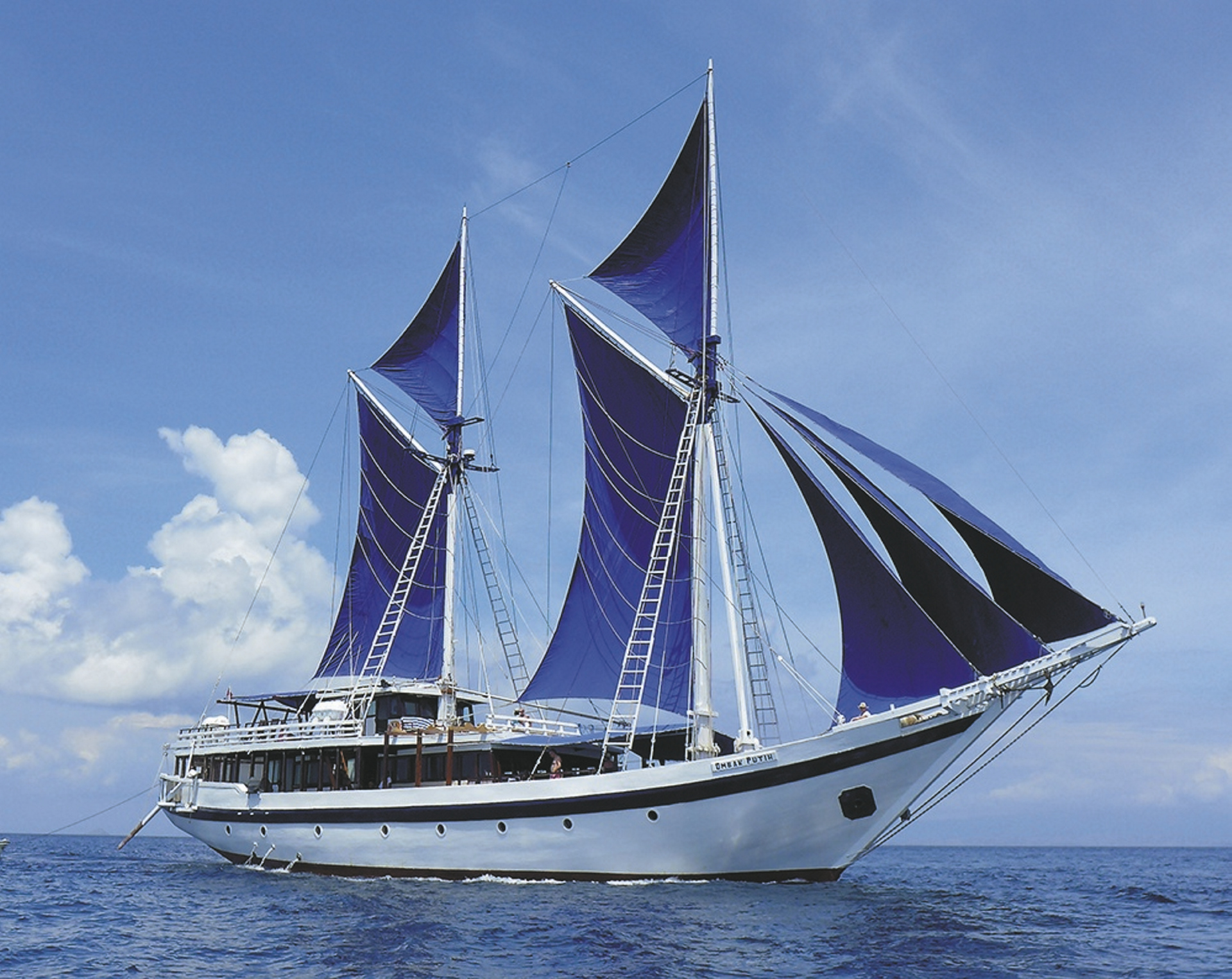 Die 'Ombak Putih' ist etwa 35 m lang, ein Dreidecker mit zwei Masten und im typisch indonesischen Stil gebaut. Diese heute seltenen "Pinisi", traditionelle Holzboote, wurden jahrhundertelang als Haupttransportmittel zwischen den 17.000 Inseln des indonesischen Archipels verwendet. Die Ombak Putih ist in der Tradition dieser historischen Schiffe gebaut und bietet dennoch modernen Komfort. Sie verfügt über 12 geräumige Kabinen mit 2 oder 3 Betten, Bad/WC und Klimaanlage, einen großzügigen Essbereich (innen und außen), eine kleine Bibliothek und ein Sonnendeck mit Liegestühlen. Die exquisite Schiffsküche bietet indonesische Spezialitäten und internationale Gerichte. Am 1. Abend findet außerdem eine Grillparty statt. Mahlzeiten, Snacks, Wasser, Tee und Kaffee sind im Fahrpreis enthalten. Wein, Bier und andere alkoholische Getränke sind gegen einen Aufpreis erhältlich. Schnorchelausrüstung und 2 Kanus sind vorhanden. Außerdem verfügt das Segelboot über ein kleines Schnellboot, das Sie an Orte bringt, die das Segelboot nicht erreichen kann. Eine Tauchausrüstung wird nicht gestellt, aber Tauchgänge können über das Schwesterschiff Ombak Biru organisiert werden. Ein europäischer Reiseleiter ist verfügbar. Dieser Segeltörn bietet Ihnen die Möglichkeit, abseits der ausgetretenen Touristenpfade zu reisen und die faszinierende Inselwelt Indonesiens auf entspannte Weise zu genießen.