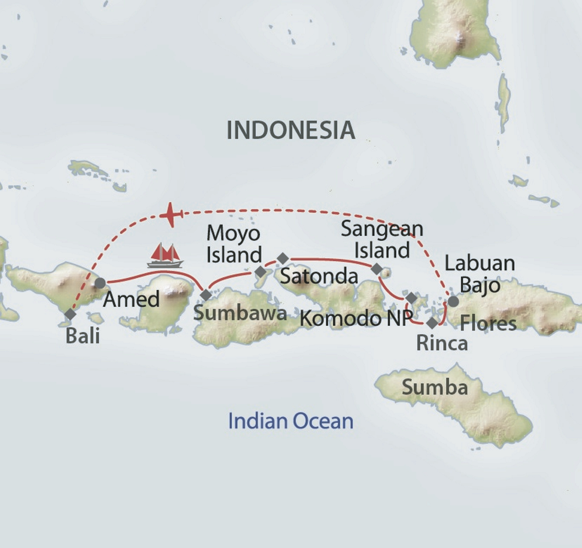 An Bord des Zweimasters Ombak Putih oder des kleineren Schwesterschiffs Katharina segeln Sie durch die Inselwelt der Kleinen Sunda-Inseln. Die Fahrten finden in der Regel abends und nachts statt, so dass Sie tagsüber viel Zeit haben, die Inseln zu erkunden.