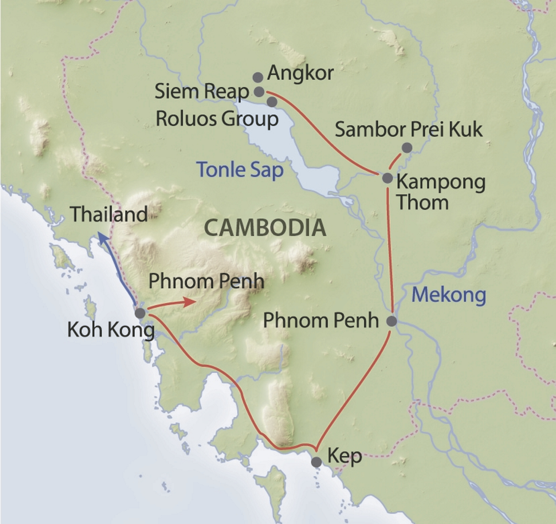 Tropische Strände, unberührte Gegenden, buddhistische Tempel und nicht zuletzt eines der größten Wunder der Welt, Angkor Wat. Auf dieser Reise kommen Sie mit den unterschiedlichsten Landschaften und Sehenswürdigkeiten in Kontakt, die das kleine Königreich Kambodscha zu bieten hat. Ein Ausklang in der unberührten Gegend der Küstenprovinz Koh Kong rundet Ihre Reise ab, wenn Sie mitten im Dschungel am Fluss sitzen und den Geräuschen der Natur bei einem Glas Wein lauschen.