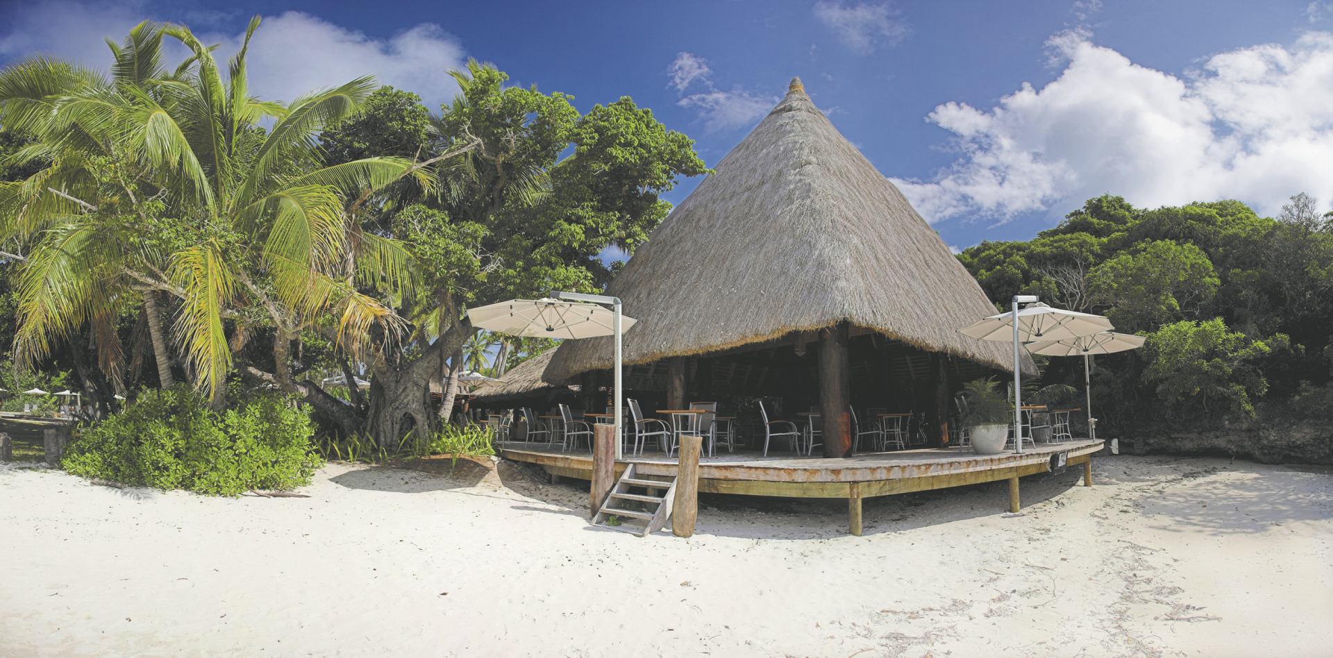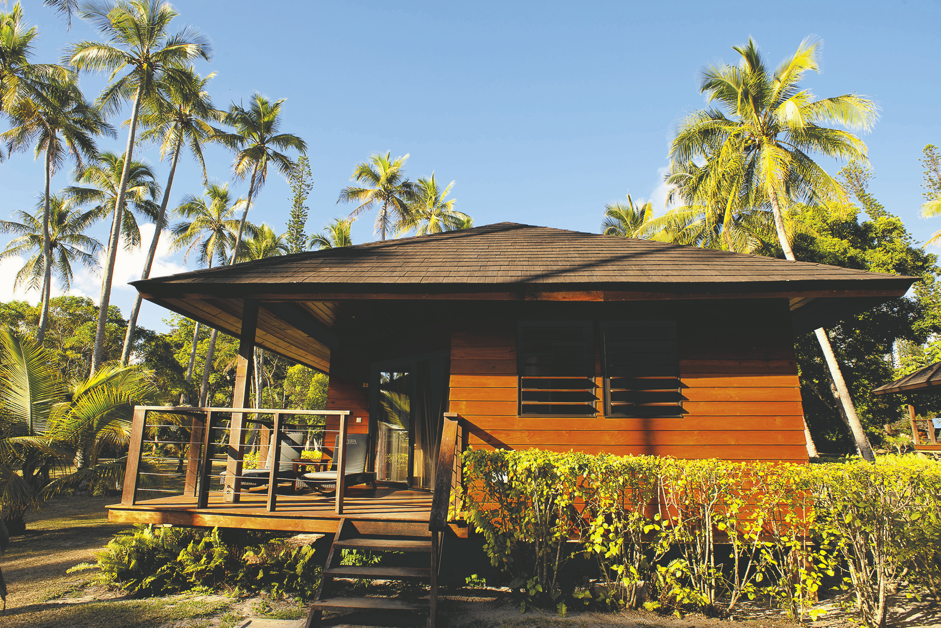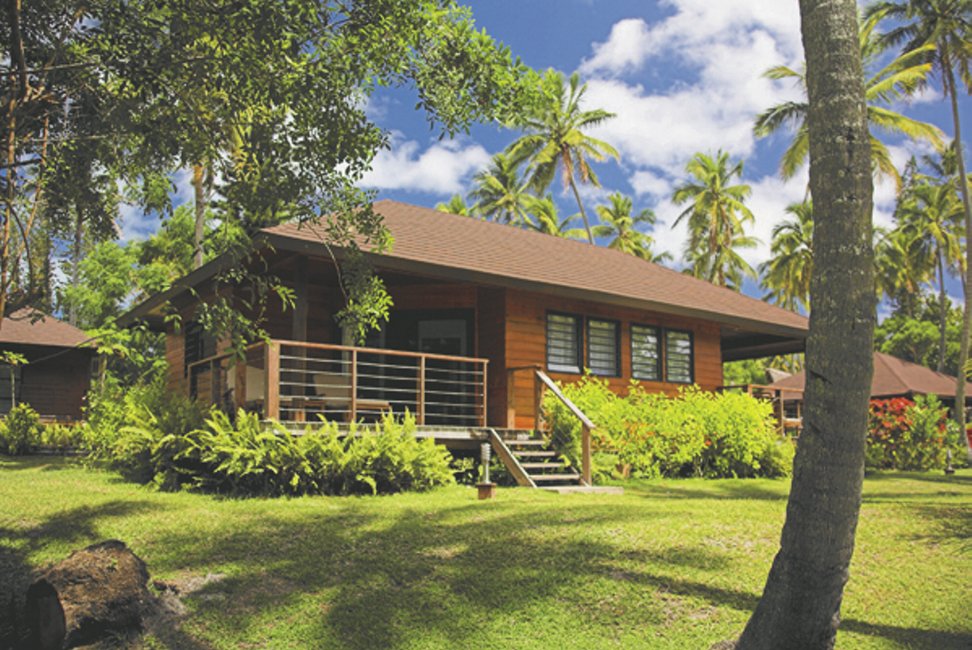 Bungalows unter Kokospalmen an der Kanumera Bucht
