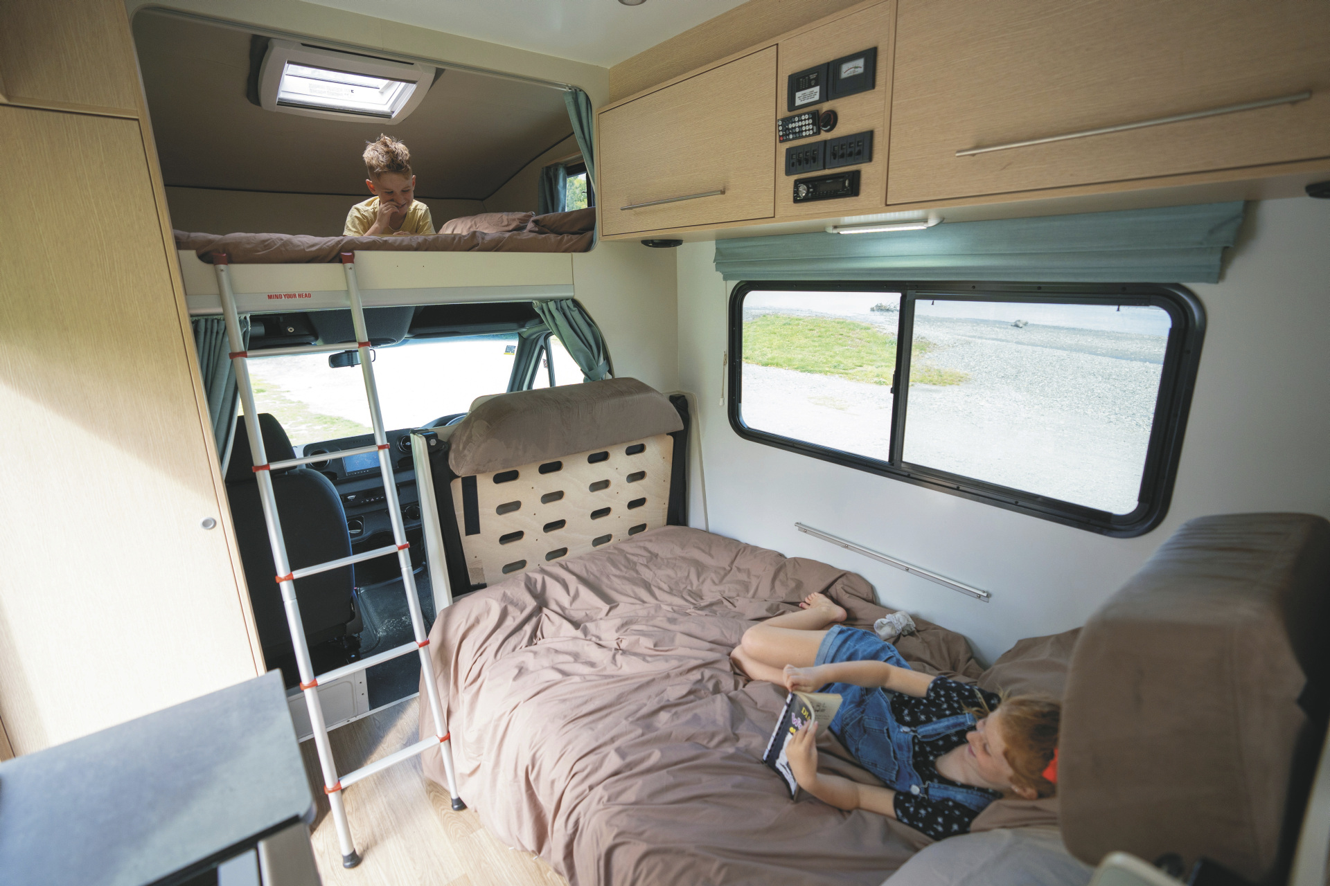 • Doppelbett über der Fahrerkabine 2,10 x 1,45 m (mit Sicherheitsnetz)