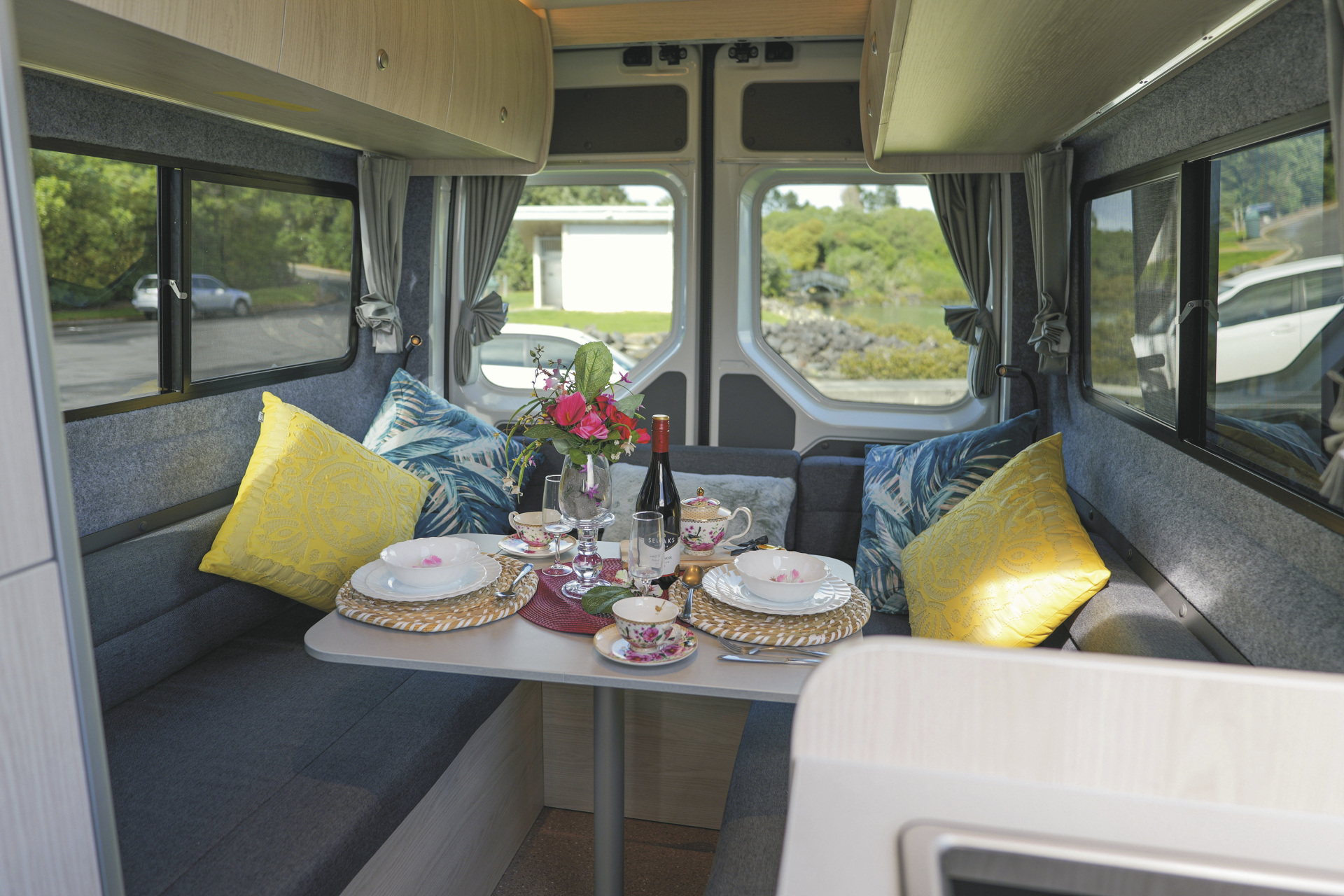Sitzgruppe im Heck, wahlweise zum Doppelbett (1,83 x 1,79 m) oder zwei Einzelbetten (je 1,83 x 0,60 m) umbaubar.