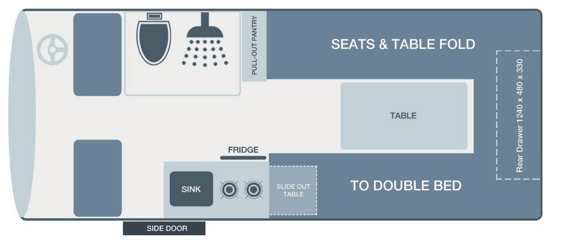 • Eingang zur Wohnkabine durch seitliche Schiebetür