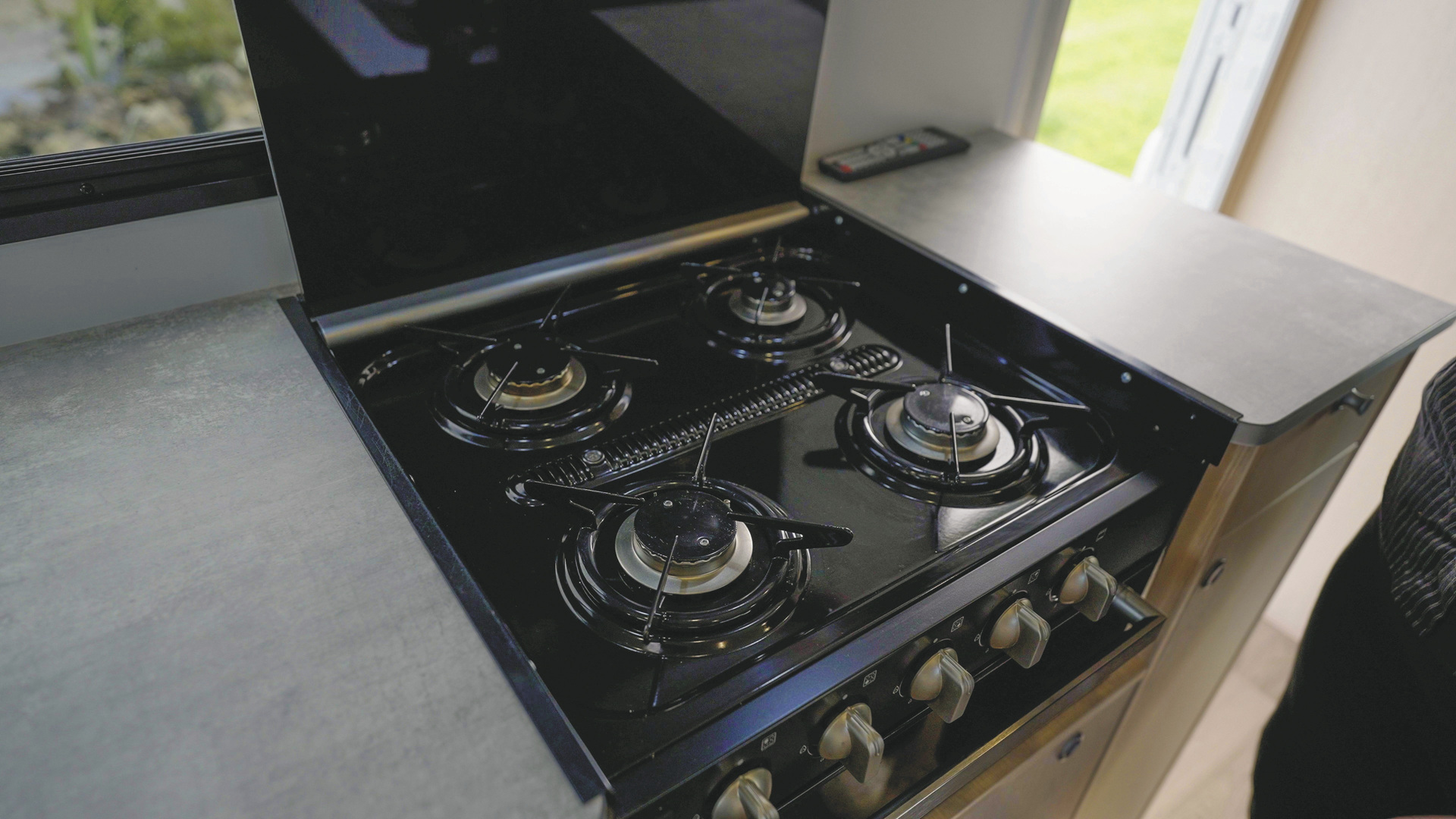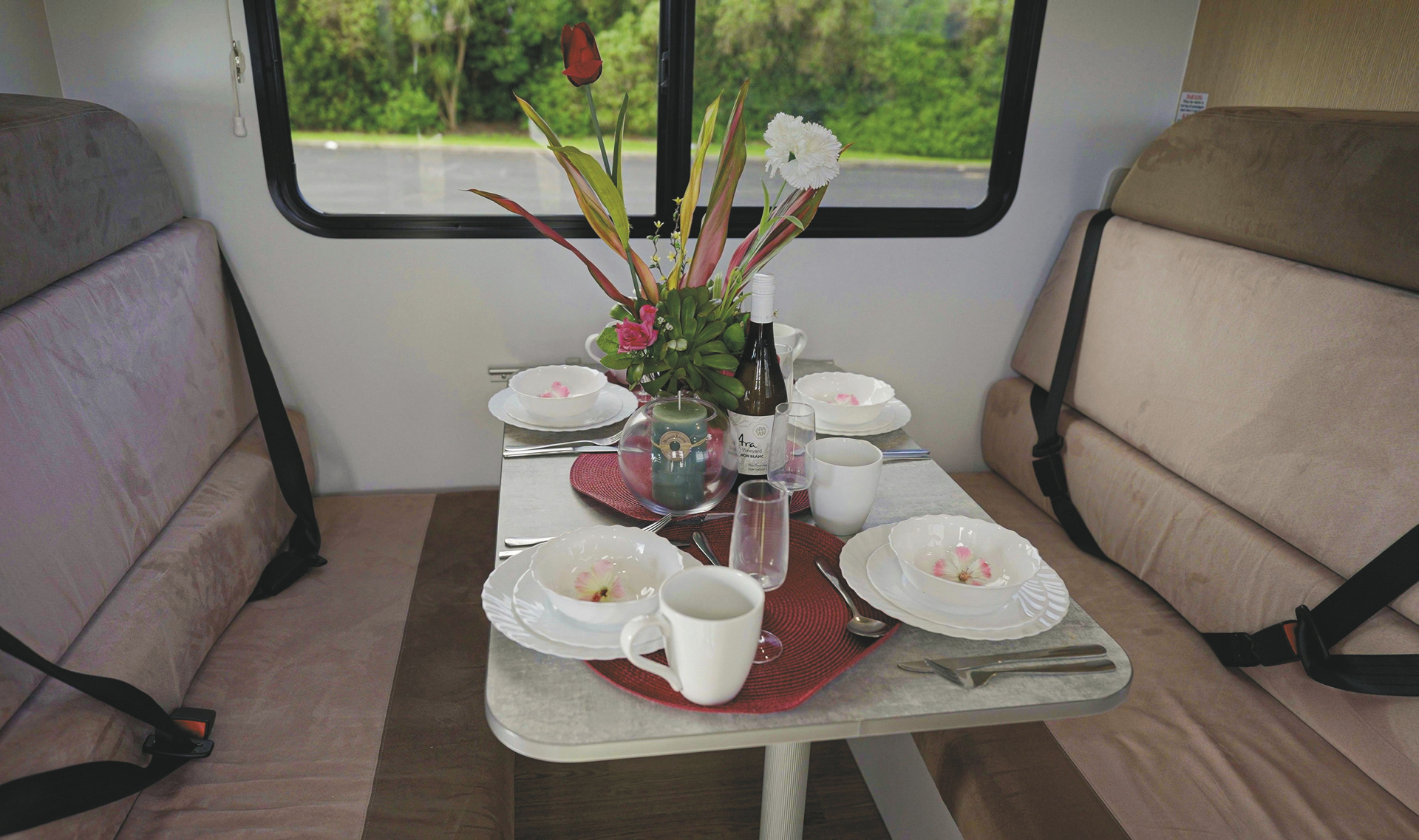 • Sitzgruppe im Heck, zum Doppelbett umbaubar (2,14 x 1,45 m)