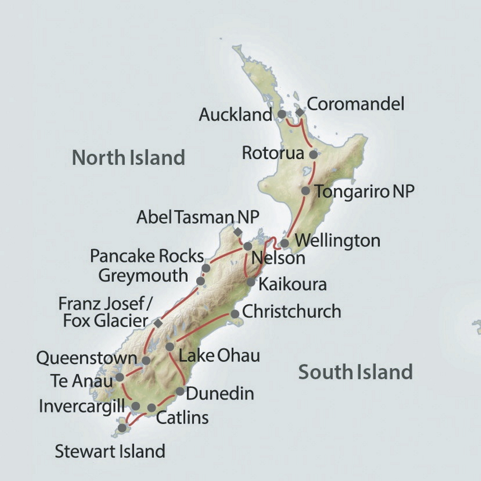 Diese Rundreise bietet ein ebenso außergewöhnliches wie abwechslungsreiches Programm. So lässt sich Neuseeland hautnah und besonders intensiv erleben - fast in seiner ganzen geografischen Ausdehnung: von der Metropole Auckland bis nach Stewart Island, dem kleinen Naturparadies ganz im Süden. Mehr Neuseeland in 19 Tagen geht kaum. Selbst die Catlins – ein Geheimtipp unter Naturfreunden – liegen am Weg und es bleibt Zeit für auftauchende Wale, die man in Kaikoura beobachten kann. Alle Touren werden von einem erfahrenen, deutschsprachigen Reiseleiter/Fahrer begleitet. So haben die Mitreisenden stets einen direkten Ansprechpartner.