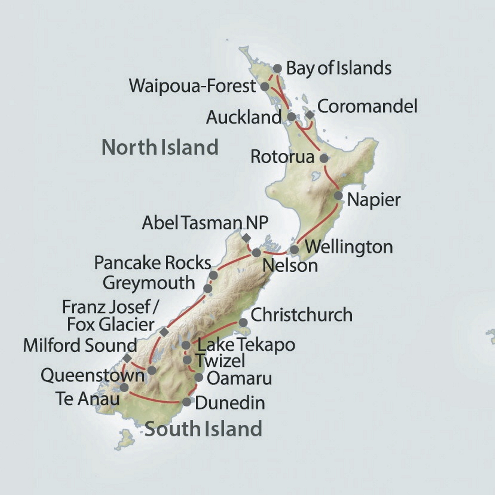 Auf dieser Rundreise erleben Sie Neuseeland nahezu in seiner gesamten Vielfalt und geografischer Ausdehnung: von der Bay of Islands und dem Waipoua Forest bis nach Dunedin und dem Fiordland Nationalpark gilt es viele Facetten des Landes zu entdecken. Begleitet von einem erfahrenen, deutschsprachigen Reiseleiter/Fahrer, haben Sie und Ihre Mitreisenden stets einen direkten Ansprechpartner.