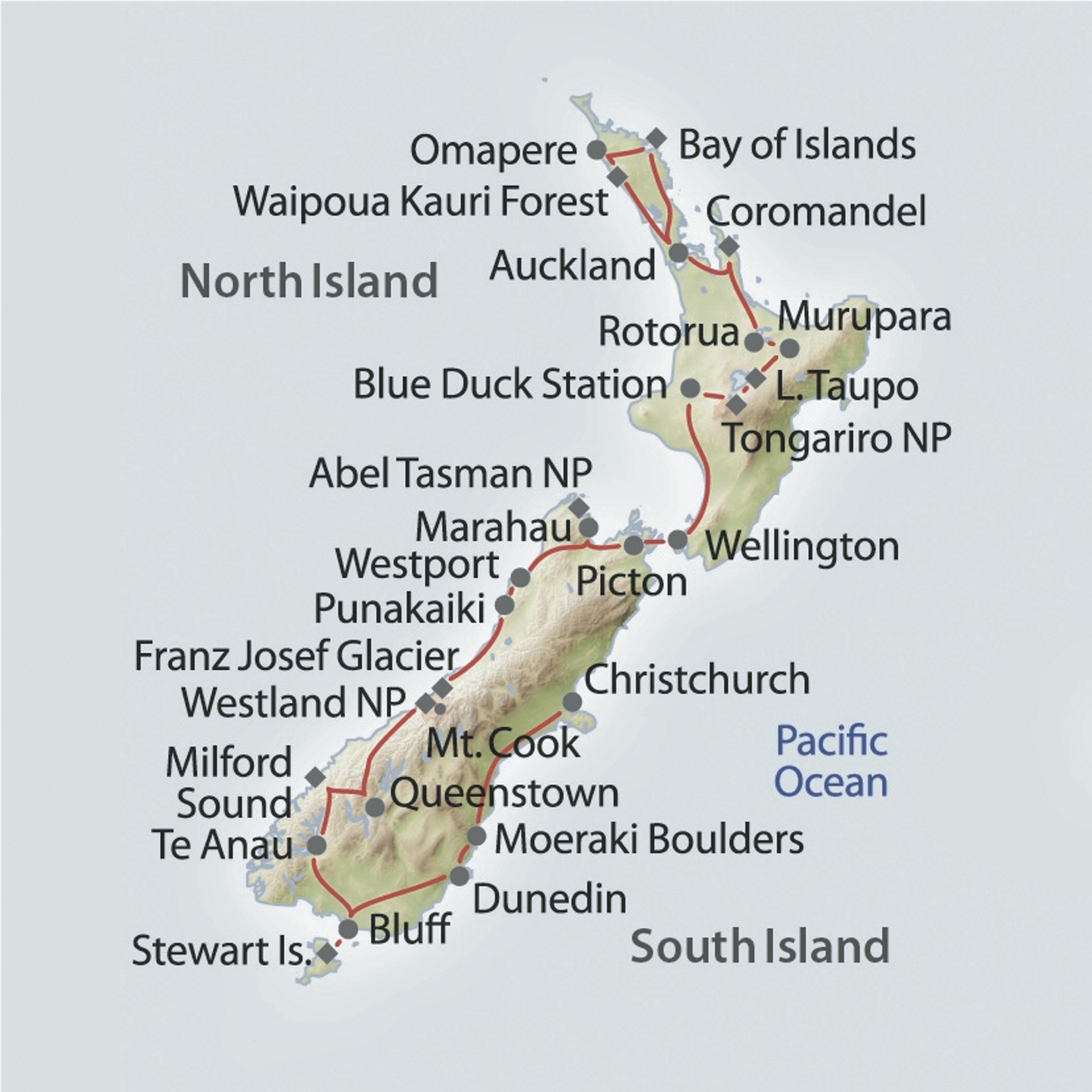 - Deutschsprachige Begrüßung (vorbehaltlich Verfügbarkeit) und Übergabe der Unterlagen; Übernachtungen in landestypischen Unterkünften; Verpflegung laut Programm (F=Frühstück, M=Mittagessen, A=Abendessen); detaillierter Reiseverlauf (in deutsch) & Kartenmaterial vor Ort; Maorikultur & Hangi-Abendessen; Buschsafari oder Kajak/Jetboot auf der Blue Duck Station (je nach Wetter); Interislander Fähre; Tagesausflug Milford Sound; Stewart Island Fähre.