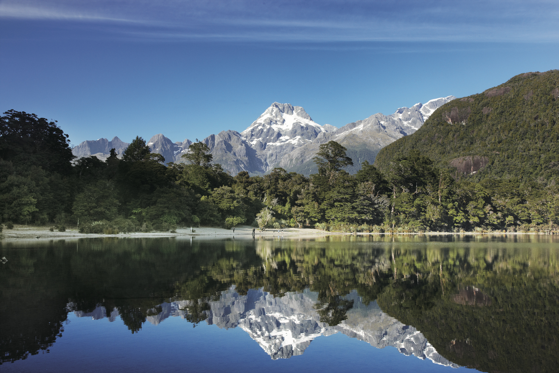Mit dem Bus geht es durch das Eglington und Hollyford Valley zum reflektierenden Wasser des Sundes mit dem über 1.000 Meter aufragenden Mitre Peak.