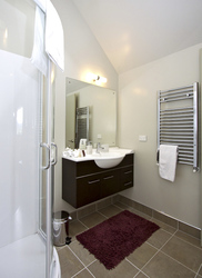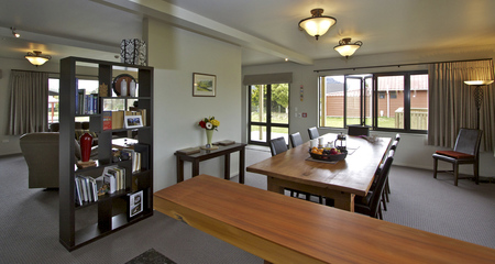 Das Ambiente des Hauses spiegelt die Umgebung wider - ein rustikaler Stil vereint mit modernen Elementen. Im Erdgeschoss befindet sich ein großer, offener Wohn- und Essbereich für die Gäste. Die Lounge ist mit einem gemütlichen offenen Kamin. Im Garten gibt es neuerdings einen luxuriösen Hotsprings Spa-Pool.