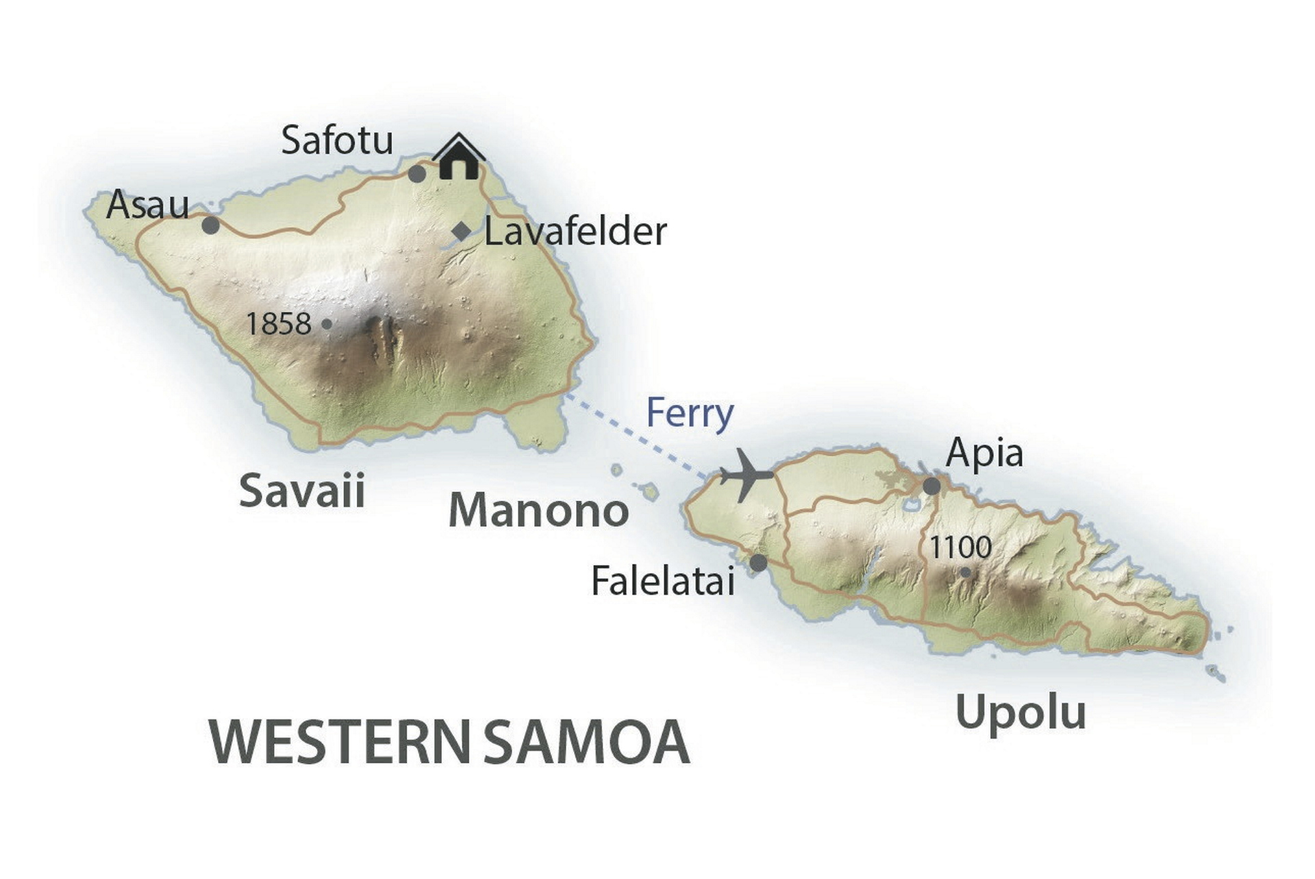 Hier sind wir auf Savaii! Das Le Lagoto Resort liegt an der Nordküste, an einem Abschnitt mit weißen, palmenumsäumten Sandstränden und an einer Bucht mit Korallengarten. Zum Hafen sind es etwa 55 Minuten.
