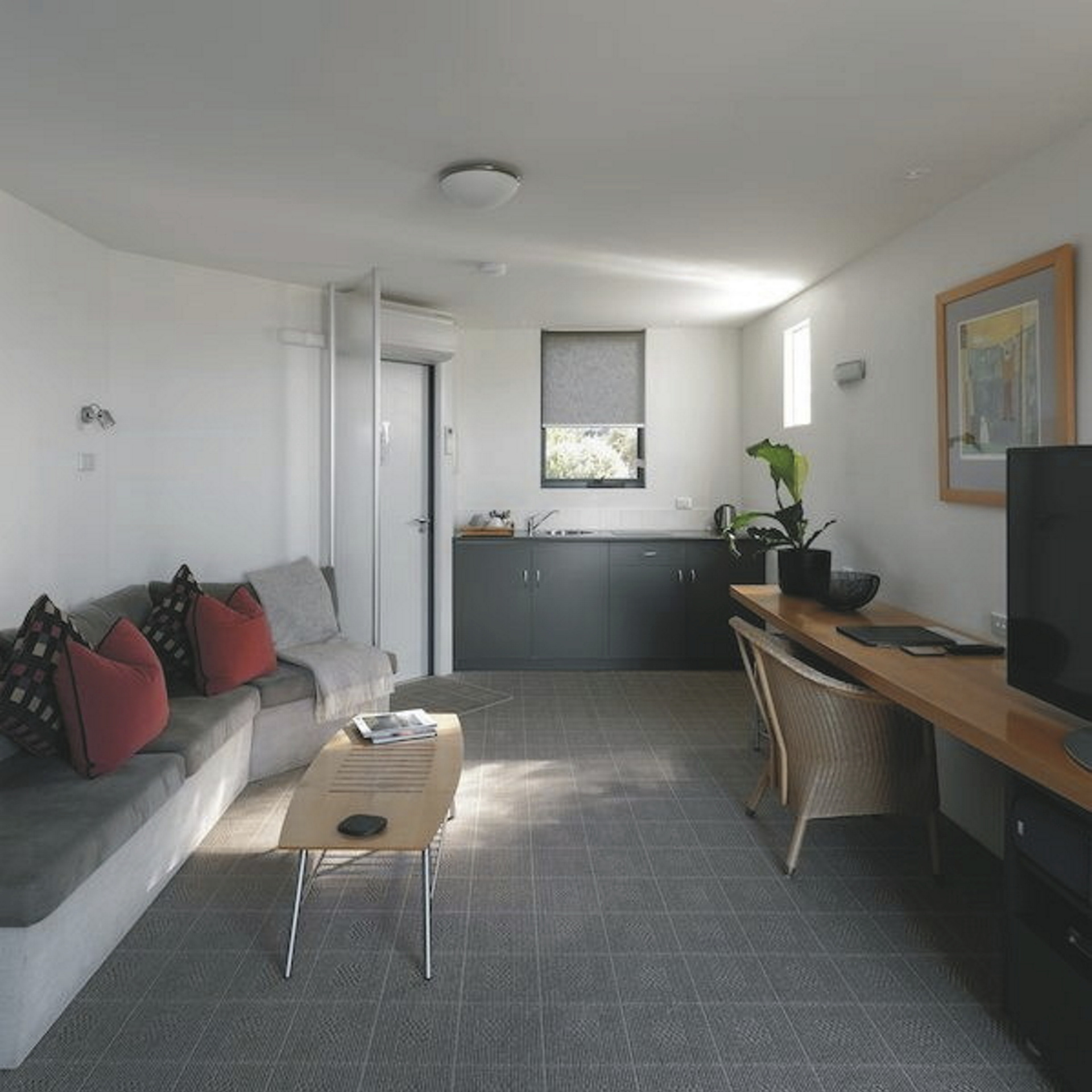 14 moderne Meerblick-Studios im Reihenhausstil und 6 Vintage Chalets, alle mit Blick über die Bucht und auf die Hazards Mountains. Studios sind zeitgemäß ausgestattet mit King-Size-Bett, Lounge-Bereich mit ausziehbarem Sofa-Bett, Bad mit Dusche/WC und Fön, LED-TV, Klimaanlage, eigenem Deck und Kitchenette mit Toaster, Tee-/Kaffeekochgelegenheit und kleinem Kühlschrank. Frühstück ist für Gäste dieser Kategorie inkludiert.