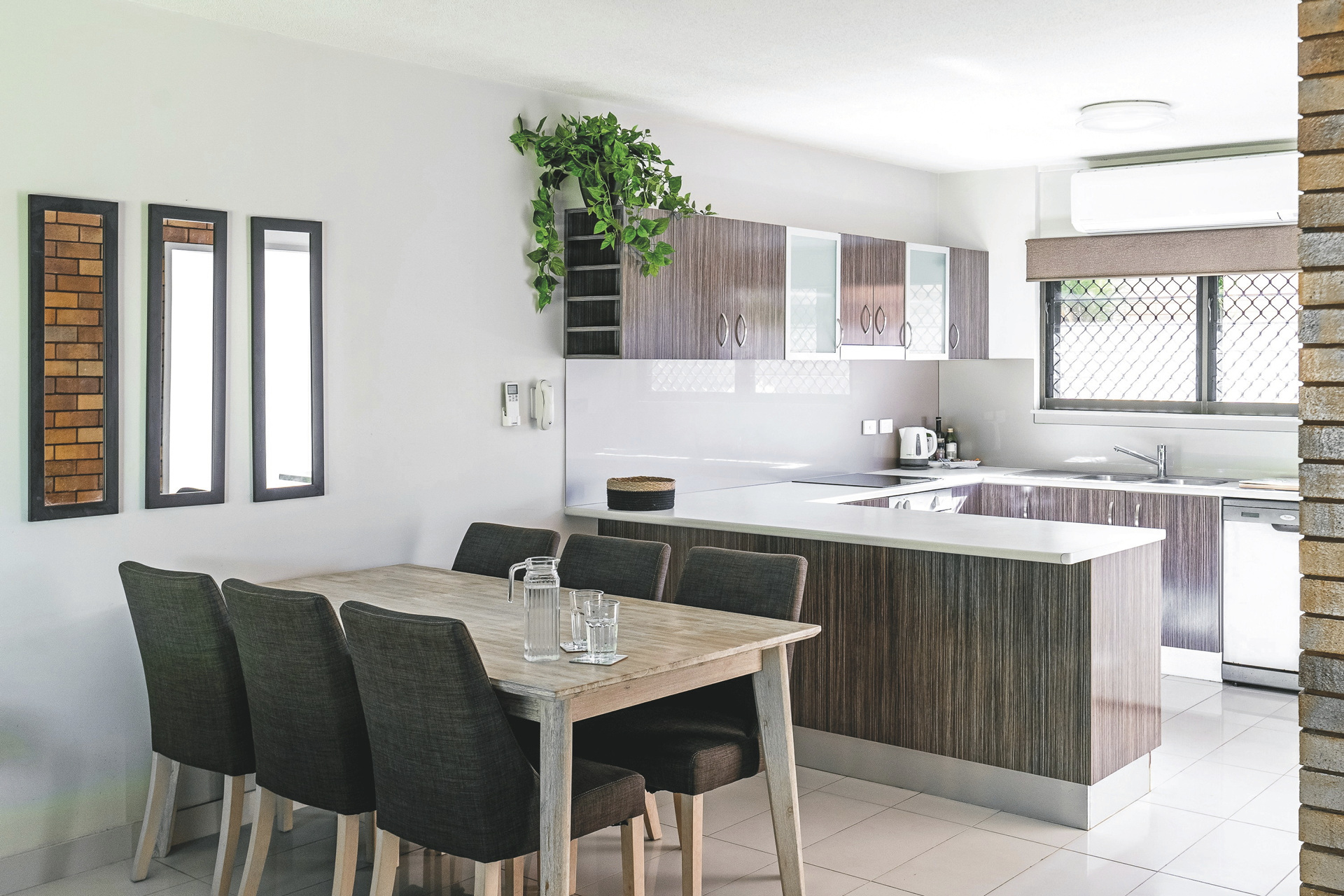 22 geräumige Townhouses (Apartments) mit zwei Etagen. Im Erdgeschoss befinden sich die Küche, der Wohn-/Essbereich und ein WC, im Obergeschoss die Schlafzimmer und das Bad mit begehbarer Dusche, teilweise auch zusätzlicher Wanne (Townhouses mit 3 Schlafzimmern haben zwei Bäder). Zur Ausstattung zählen u.a. Klimaanlage und Ventilatoren, Fön, Smart-TV, eine voll ausgestattete Küche mit Tee-/Kaffeezubereiter, Waschmaschine/Trockner sowie eine Terrasse im Erd- und ein Balkon im Obergeschoss. Vor jedem Townhouse befindet sich ein überdachter Parkplatz.