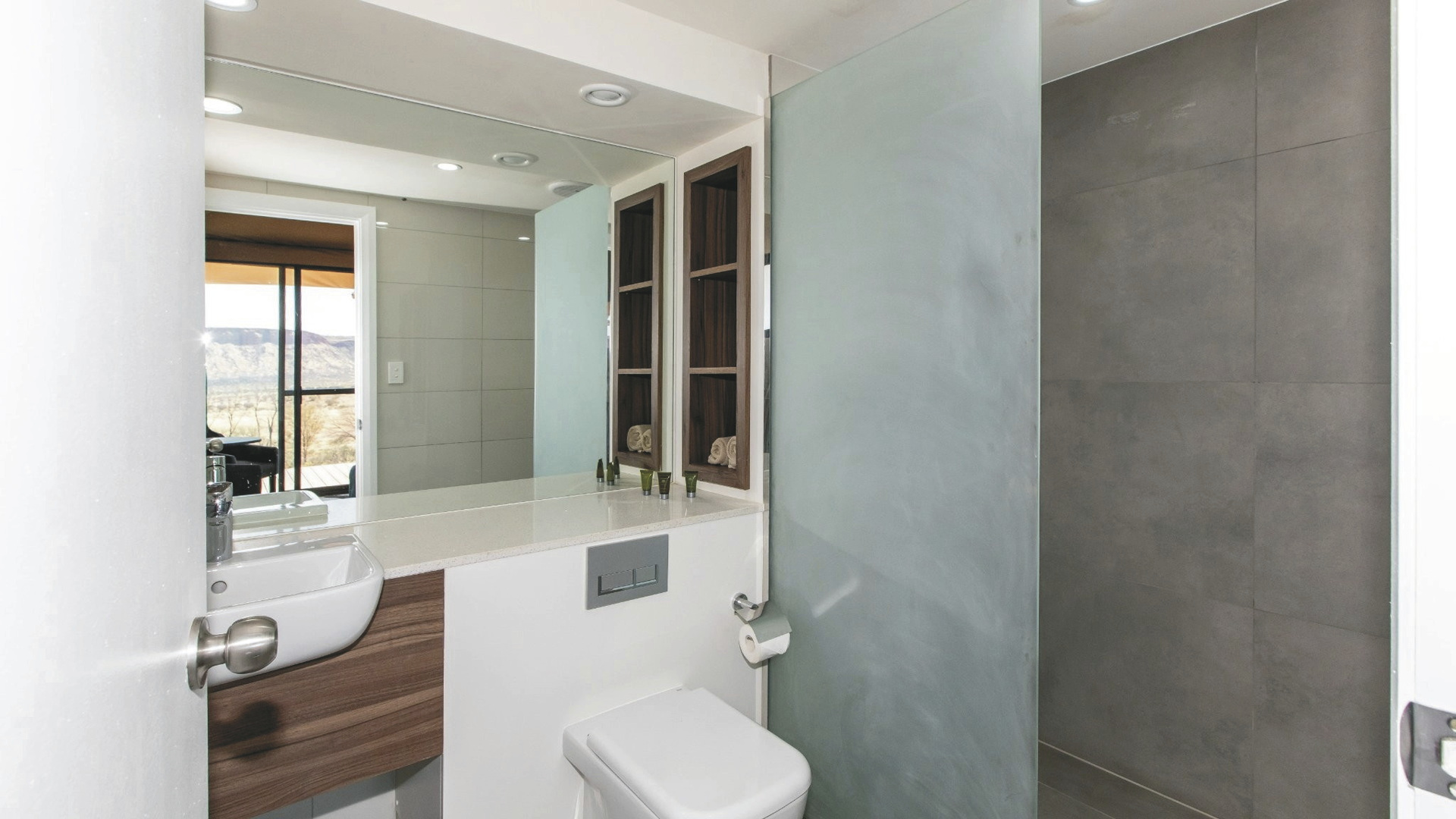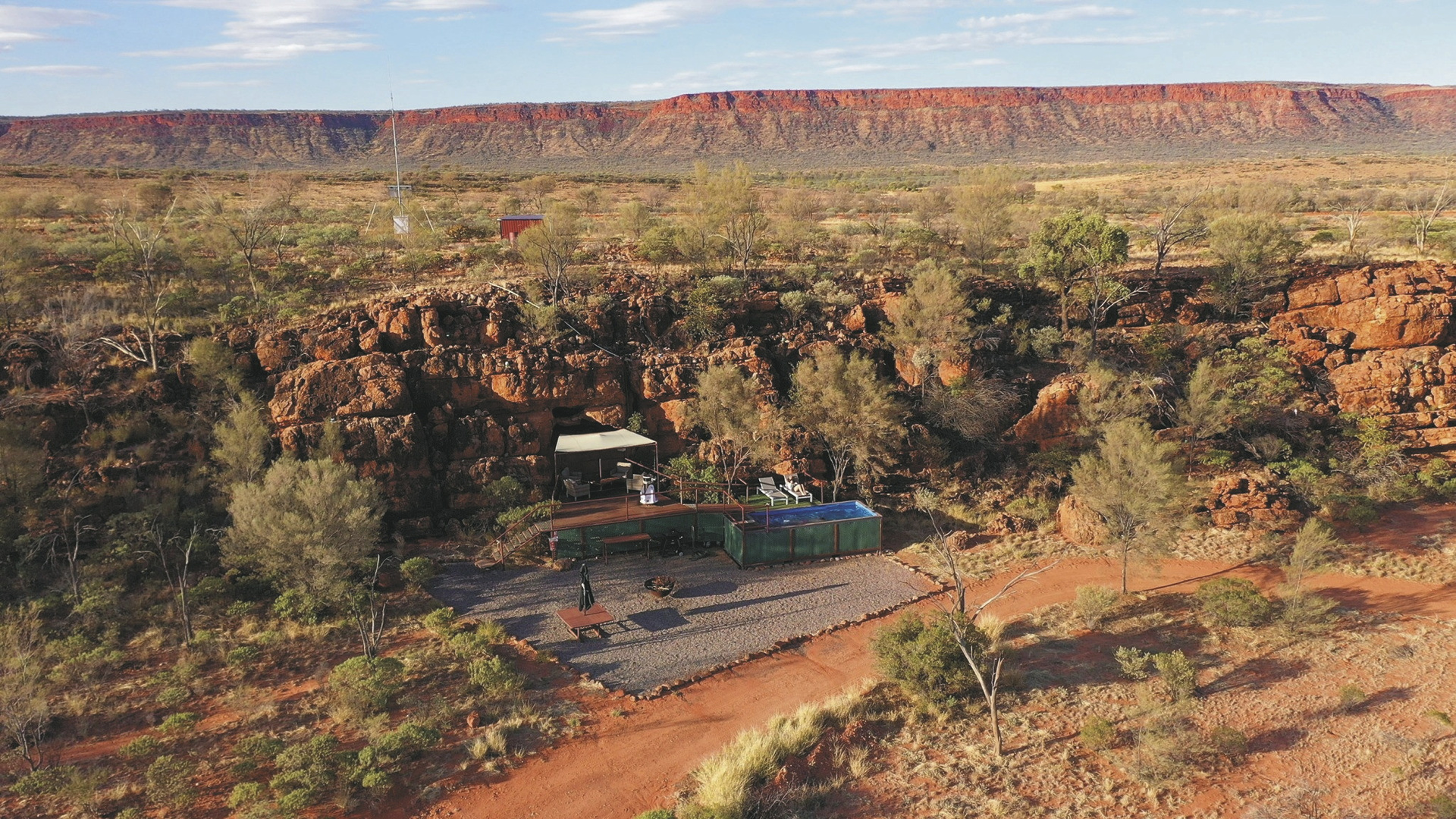 Die größeren und komfortabler ausgestatteten Dreamtime Escarpment-Zelte liegen erhöht entlang eines Felsrands in abgeschiedener Lage (ca. 7 km von der Rezeption und dem Cafe entfernt; 4WD-Fahrzeug empfohlen) und bieten mehr Privatsphäre, weite Ausblicke sowie gute Luftzirkulation. Sie verfügen u.a. über ein eigenes Bad mit Outdoor-Dusche, Kingsize-Bett oder zwei Einzelbetten, hochwertige Bettwäsche, Bademäntel und Slipper, Klimaanlage, Heizung, Stromanschluss und Kaffeezubereiter. Ergänzt wird die Ausstattung durch eine private Außenfläche mit Sitzmöglichkeiten und Feuerstelle. Gäste erhalten zusätzlich ein Verpflegungspaket mit BBQ-Dinner und Frühstück zur Selbstzubereitung. Ein Poolbereich steht ebenfalls zur Verfügung.