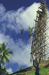 Tagesausflug zur Insel Pentecost zum todesmutigen Ritual Nagol. Die Lufttaucher springen für eine reiche Ernte von einem 30 m hohen Gerüst mit dem Kopf voraus, eine elastische Baumliane um die Fußfessel. Tanz begleitet das mystische Ritual, das Manneskraft beweisen soll. Während der Anreise überfliegen Sie die Insel Ambrym mit den Zwillingskratern Marum und Benbo.